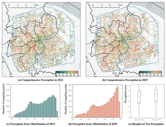 Mapping the human comprehensive perception scores of Shanghai using 6 perceptual indicators. (a) Comprehensive perception scores in 2013; (b) Comprehensive perception scores in 2019; (c) Perception score distribution in 2013; (d) Perception score distribution in 2019; (e) Boxplot of two perception scores.