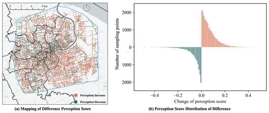 Figure 6b presents the distribution of perception score differences across all sampling points. The results indicate that, while the overall distribution approximates a normal distribution, it exhibits high kurtosis and a slight left skew, meaning that values are concentrated around the mean, yet a proportion of extreme changes still exists. To enhance the visual contrast, the histogram bars representing areas with declining perception scores are inverted and highlighted using cool tones. As shown, the decline in perception scores is primarily concentrated within the [−0.1, 0] interval, whereas perception score improvement is most commonly observed within the [0, 0.2] range. Overall, although some areas experienced a decrease in perception scores, both the proportional distribution and the directional trend suggest a general upward shift in urban perception scores across the city. This reflects the impact of Shanghai’s accelerated economic development and urban construction in recent years, which has contributed to a sustained enhancement of the overall urban environment.