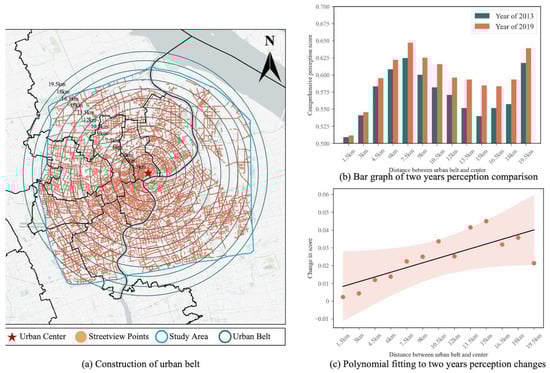 Figure 7b compares the average urban perception scores within each ring for the years 2013 and 2019. The results show that the perception scores in all 13 rings were higher in 2019 than in 2013, indicating a consistent pattern of improvement across both inner and outer city areas. In terms of trend, the average perception score increases by approximately 0.024 for every 1.5 km of distance from the city center. However, the overall pattern fluctuates (“rise–decline–rise”), reflecting the spatial allocation of urban development resources over the past six years: midtown areas (roughly corresponding to middle rings) received the most intensive investment, followed by outer districts, with inner-city areas seeing comparatively less enhancement.