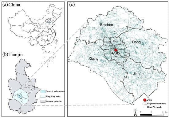 Overview of study area for the present study. (a) Tianjin is located in the north of China. (b) Tianjin overview. (c) Names of districts in the study area, CBD locations.