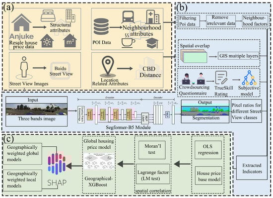 The main steps of the research framework are outlined below, as shown in Figure 2, summarizing the workflow of this study, which includes data collection, feature extraction, property price modeling, and analysis. First, we collected a multi-source dataset consisting of street view images, Points of Interest (POI), neighborhood information, and basic property attributes. Second, we extracted multiple features from these datasets and collected subjective perception scoring data from 45 participants in Tianjin through a crowdsourced visual survey. Third, we established a basic property price model using Ordinary Least Squares (OLS) and tested spatial autocorrelation, dependency, and potential spatial heterogeneity using Moran’s I test and the Lagrange multiplier test on its residuals. We then explored the spatial relationships between property prices and related factors using Geographical-XGBoost (version 1.0.9). Finally, we compared the impact of property price determinants on property prices, considering geographical location, using the global model. We also analyzed the strength of these determinants through SHAP interpretability analysis, and visualized the spatial heterogeneity of the study area using SHAP values from the local model.