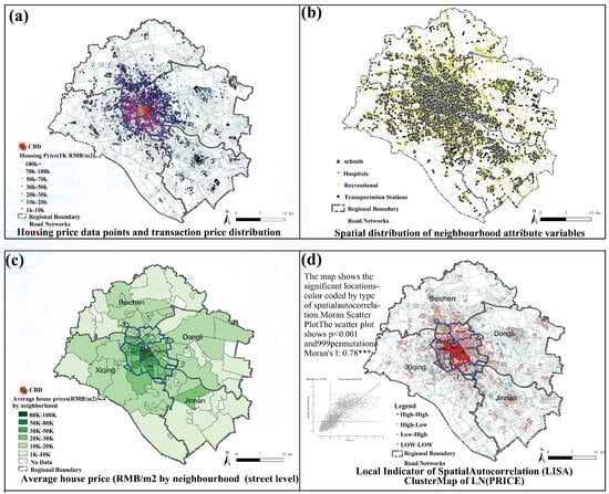 Spatial distribution of (a) housing transaction price, (b) neighborhood attributes including amenities and service POIs, transportation stations, hospitals, and schools, (c) average housing price (RMB/m2) by municipal neighborhood boundary, and (d) LISA cluster analysis (hotspot) of price.Moran Scatter Plot: *** indicates statistical significance at the 0.001 level. The red line in the scatter plot represents the linear regression line for the spatial autocorrelation values.