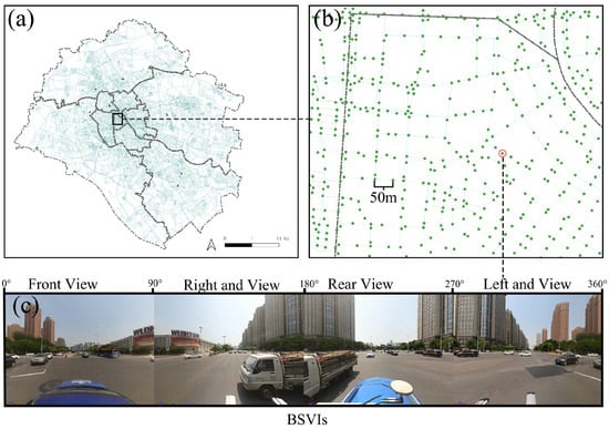 Example of the BSVIs collection process. (a) Street view images were collocated based on OSM, and we established street view collection points at 50 m intervals.The green dots represent the locations of these collection points. (b) Boxed area in (a). (c) Panoramic street view of the points circled in (b).
