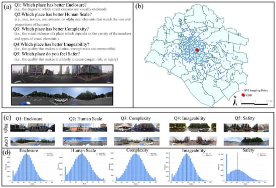 For the selection of subjective perceptions, this study draws on urban design theory [] and selects four design qualities: “1. enclosure,” “2. human scale,” “3. complexity,” and “4. imageability.” In addition, we refer to the urban scene understanding from the Place Pulse project [] and add “5. safety” as a perceptual dimension, as it has been shown to significantly influence residents’ behavior [,]. In total, five design qualities were chosen to measure subjective perceptions of street scenes. Inspired by Place Pulse 1.0 [], we randomly sampled 300 SVIs to ensure coverage of both the six central urban districts and the four suburban districts in Tianjin, as seen in Figure 4b, and established a crowdsourced visual survey platform. Participants could choose a preferred photo from two randomly selected SVIs and answer questions such as “Which place has a better enclosure?” Each question provided a clear qualitative definition; the evaluation process was double-blind, with the geographic location of the images not revealed (Figure 5a). Since non-expert pedestrians may have a vague conceptual understanding of the five design qualities, this study involved participants with relevant training backgrounds to conduct pairwise comparison assessments, in order to reduce measurement noise and ensure construct validity. A total of 45 master’s-level urban design researchers participated (26 males, 19 females; average age = 24). Participation was voluntary and anonymous, with informed consent obtained prior to participation. No personally identifiable information was collected. The TrueSkill Bayesian scoring system was used to convert pairwise votes into ranking scores. This system generates scores for winners and losers after each comparison, and standardizes the scores to a 0–1 range. The results from the 300 SVIs were used to construct and evaluate the perceptual prediction model [,]. Furthermore, the dataset achieved a passing rate of over 75%, indicating good internal consistency of the manual ranking process. Each SVI was compared between 20 and 36 times on average (Figure 5c), and a total of 4321 pairwise ratings were collected (Figure 5d). Compared to similar studies, the results are reliable [,].