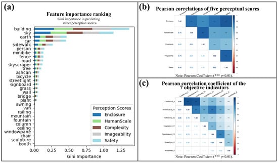 According to the Pearson correlation matrix results for the seven objective street scene structural features in Figure 6c, most groups exhibit significant positive correlations (). In particular, the correlation coefficients between “CoreStruct_A” and “StreetSpace_B1” and between “CoreStruct_A” and “Traffic Infrastructure” (TrafficInfra_B2) reach 0.87 and 0.86, respectively, indicating that the skeletal features of urban space are strongly interlinked within the visual landscape. This is likely because the primary elements forming the basic framework of urban space—such as buildings, roads, sidewalks, vehicles, and pedestrians—tend to co-occur and co-distribute, thereby forming the backbone of street scene structures. By contrast, vegetation (Vegetation_C1), open natural areas (OpenNatural_C2), and street furniture (StreetFurn_D) show weaker correlations with the main structural components (), reflecting their greater spatial independence and distinctiveness. Architectural details (ArchDetail_E) display the lowest correlations with all other categories, primarily appearing as independent visual features at the structural detail level. Although their overall weight is relatively small, they may hold unique value in enhancing perceptual dimensions such as recognizability.
