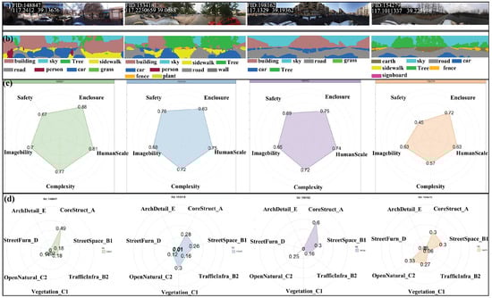 (a) Original SVI sample, (b) semantic segmentation results, (c) predicted subjective perception scores, and (d) aggregated objective perspective metrics. The radar chart displays scores and perspective metrics on a scale from 0 to 1, from the inside to the outside.