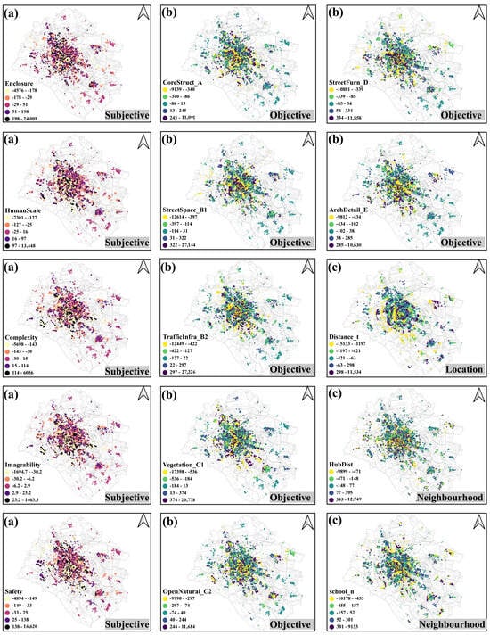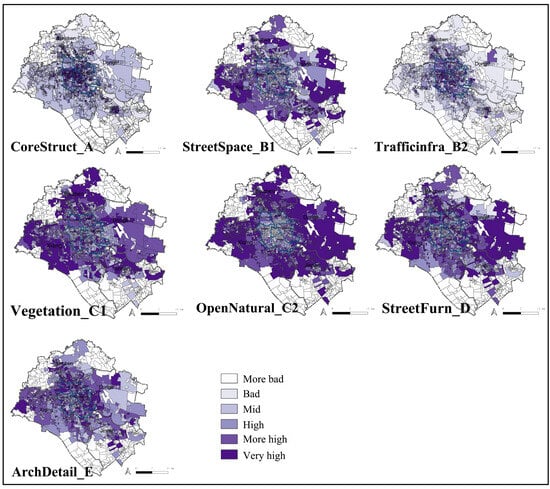 The spatial distribution of the seven objective street scene features (Figure 8) collectively shows a spatial gradient that follows a “compact-center, loose-periphery” pattern. The six central urban districts generally contain high-value clusters of core structures (CoreStruct_A), traffic flow (TrafficInfra_B2), street space (StreetSpace_B1), and architectural details (ArchDetail_E), particularly along the continuous belt spanning Heping, Nankai, and Hexi, as well as the corridor of the Hai River. These high-value zones correspond to areas of high-density building fabric, continuous street walls, historically significant architectural ensembles with rich facade details, and nodes of intense traffic activity. By contrast, the four suburban districts primarily exhibit high-value clusters of vegetation (Vegetation_C1) and open natural areas (OpenNatural_C2), which are extensively distributed along ecological corridors and in low-density residential areas. Street furniture (StreetFurn_D) reaches high values in localized areas along major thoroughfares and gateway nodes, while in most other areas it serves primarily functional rather than decorative roles. Core structures (CoreStruct_A) and traffic flow (TrafficInfra_B2) remain generally low in the periphery, with only localized high-value clusters emerging around district centers and transportation hubs.