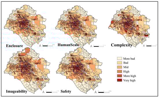 Based on the correlations between subjective perceptions and spatial patterns, significant positive relationships were observed among the five perception dimensions overall (Figure 6b). In particular, the correlations between “enclosure–safety” (), “human scale–complexity” (), and “recognizability–safety” () are especially pronounced, suggesting that certain perceptions may be driven by similar spatial environmental factors []. By contrast, relatively weaker correlations, such as “complexity–recognizability,” suggest divergences in how these dimensions are understood. The strong interrelations between perception dimensions also expose blurred conceptual boundaries, highlighting the need for further theoretical refinement to reduce semantic ambiguity in subjective perception measurement. Figure 9 illustrates the spatial distribution of subjective perceptions across the study area. The six central urban districts exhibit high-value core zones across all five perceptual dimensions, whereas the four suburban districts display generally lower levels, with improvements only in specific new district centers, industrial parks, and recently developed residential areas. This differentiation closely aligns with the spatial patterns of objective features: the mature street networks, functional mix, and historical character of the central districts contribute to higher positive perceptions, while the low density, fragmented land uses, and diffuse boundaries of peripheral districts constrain perceptual improvements.