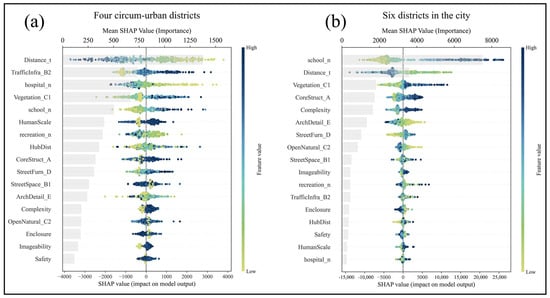 To further investigate this heterogeneity, G-XGBoost global models were trained separately for the six urban and four suburban districts (see Table 5, Model 0, and Model 1). The SHAP summary plot visualizes each variable’s importance, direction, and impact distribution (Figure 11). Gray bars indicate the average contribution of each variable, with SHAP values on the X-axis representing positive or negative effects, and features sorted by importance on the Y-axis. Colors range from light yellow (low) to dark blue (high), reflecting feature magnitudes. Considerable differences in feature rankings between the urban districts (Figure 11b) and suburban districts (Figure 11a) suggest that homebuyers’ preferences vary markedly across regions.