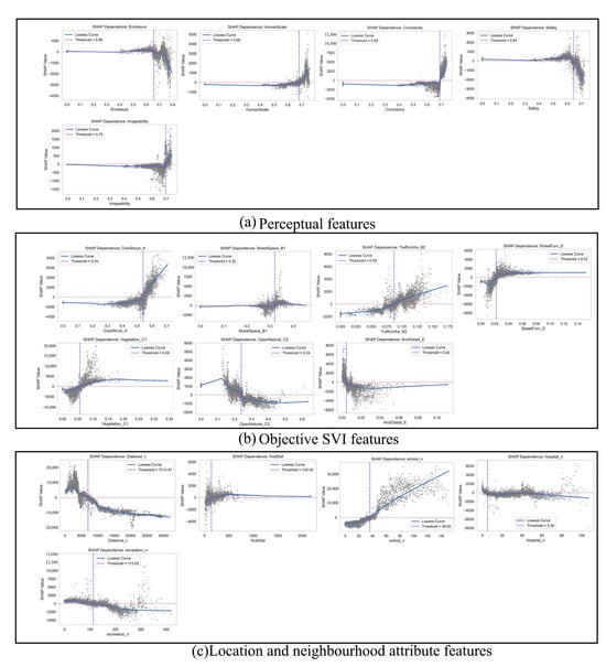 To further explore the nonlinear variation characteristics and potential threshold effects within different value ranges, the SHAP dependence plot in Figure 12 is plotted based on the Geographical-XGBoost global model, as shown in Table 5, Model 2, systematically illustrating how subjective perception features, objective street view characteristics, and locational and neighborhood attributes contribute positively and negatively to housing prices at different value levels. This helps identify key turning points and nonlinear relationships at the global scale. In this study, all subjective perception variables exhibit pronounced nonlinear effects with clear thresholds (Figure 12a). Enclosure, HumanScale, and Safety show near-zero contributions in the low-value ranges (<0.6), with SHAP values fluctuating within ±2000 CNY/m2. Once the feature values reach approximately 0.66, 0.68, and 0.64, respectively, their contributions increase sharply (exceeding +8000 CNY/m2), reflecting the strong positive effect of improvements in enclosure, human scale, and safety on housing attractiveness. The enclosure, safety cues, and recognizability related to through-travelers exhibit stronger positive and threshold effects on public transportation corridors (e.g., limited impact below 0.60, with a significant enhancement in the 0.64–0.68 range). Notably, Enclosure reverses around 0.70, turning negative (about −4000 CNY/m2), possibly due to a sense of spatial oppression caused by excessive enclosure. Imageability and Complexity show negative effects in the low-value range (as low as −6000 CNY/m2), but rapidly shift to strong positive contributions (around +10,000 CNY/m2) after their respective thresholds, indicating that enhanced recognizability and design complexity can substantially increase housing desirability.