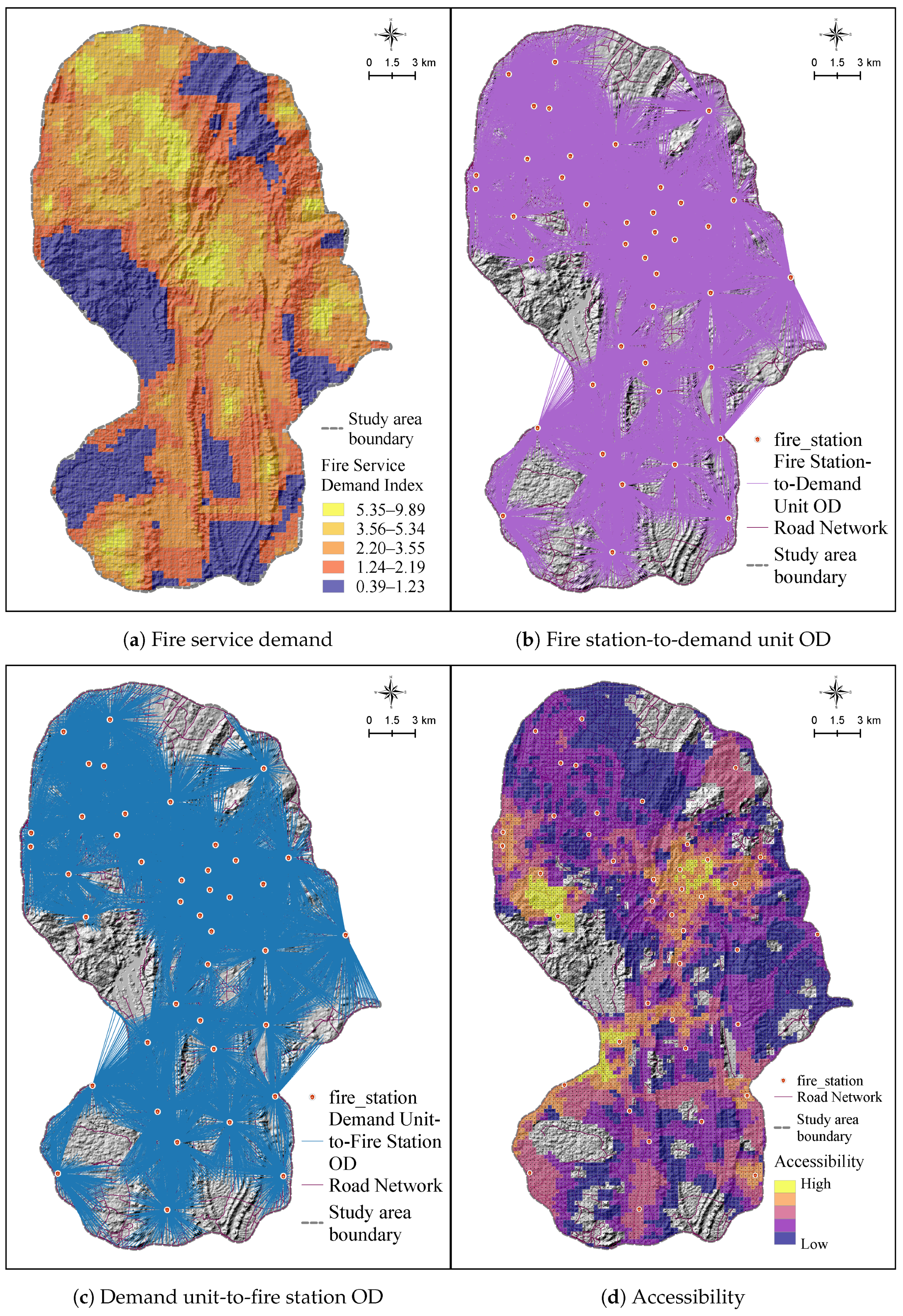 - Balasubramani, K.; Gomathi, M.; Prasad, S. GIS-based Service Area Analysis for Optimal Planning Strategies: A Case Study of Fire Service Stations in Madurai City. Geogr. Anal. Union Geogr.-Infor-Mation Technol. 2016, 5, 11–18. [Google Scholar]