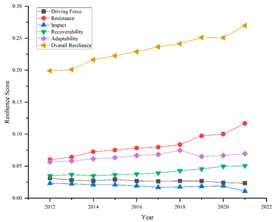 Figure 7). This indicates a transition of the overall resilience level from a low-resilience classification to a moderate-resilience classification. The continuous improvement in flood disaster resilience in the Central Plains Urban Agglomeration can be attributed to the ongoing socio-economic development and the emphasis on enhancing disaster management capabilities over the past decade, as well as the implementation of high-quality urban development policies. Comparing the average resilience scores across five dimensions reveals the following hierarchy: overall resilience > resistance resilience > adaptive resilience > recovery resilience > driving resilience > impact resilience. This pattern highlights the close relationship between the overall resilience enhancement of the urban agglomeration and the resilience, recovery capacity, and adaptability of urban systems. Although driving and impact factors exert direct negative effects on urban flood disaster resilience, their trends contrast sharply with the overall resilience score trends. The adverse impacts of flood disasters on urban systems are insufficient to undermine the development of urban resilience. Over the past decade, both adaptability and recoverability have steadily improved, indicating that positive results have been achieved across regions in terms of policy guidance and infrastructure development. In contrast, the impact indicator has shown significant fluctuations, suggesting that changes in the external environment continue to exert strong disturbances on urban resilience. Therefore, to enhance urban flood disaster resilience, it is crucial to focus on strengthening the inherent resistance, recovery, and adaptability levels of urban systems.