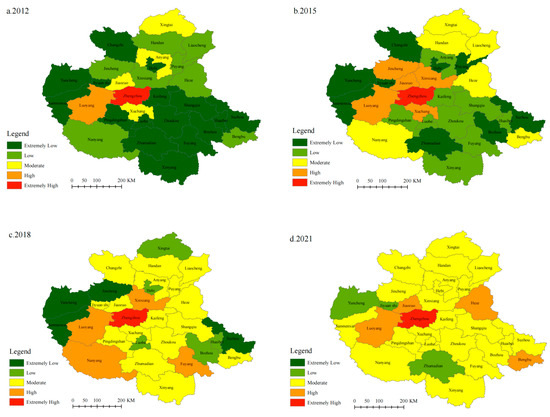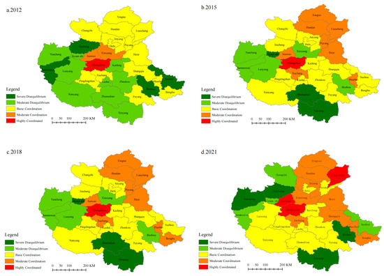 To more intuitively reflect the coupling coordination levels of flood disaster resilience across cities, the coupling coordination degree of 30 cities in the Central Plains Urban Agglomeration was classified for the years 2012, 2015, 2018, and 2021 using ArcGIS 10.8 software, as shown in