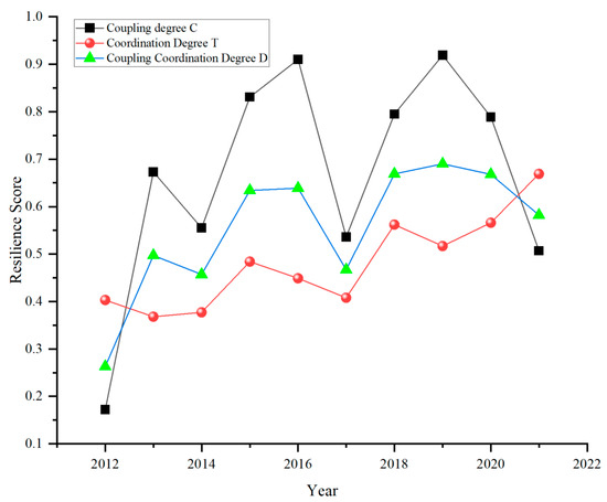 Figure 16. The coupling degree consistently remained higher than the coordination degree, and the gap between the two gradually narrowed, indicating an enhancement in overall cooperation and a trend toward positive development. The coupling degree (C) ranged from a maximum of 0.919 to a minimum of 0.172, experiencing three declines, but the overall impact was minimal, reflecting the increasing interconnection among the driving force, resistance, impact, recoverability, and adaptability dimensions. The variation in the coordination degree (T) followed a similar pattern to the coupling degree, with C decreasing and T increasing from 2020 onward. This suggests a weakening of the interactions between the five dimensions; however, the national investments in flood disaster management and improvements in infrastructure have strengthened urban resistance and recovery capabilities, thereby verifying the enhancement of the synergistic effects. Overall, the coupling coordination degree (D) increased from 0.263 to 0.669, representing a 154% growth, demonstrating a strengthening of the synergistic effects between the sub-dimensions. This shift indicates a gradual adjustment from moderate disequilibrium in 2012 to a state of marginal coordination. The coupling coordination degree between the sub-dimensions of urban flood disaster resilience has had a certain impact on the overall resilience level. From the evolution of the Central Plains Urban Agglomeration’s flood disaster resilience (