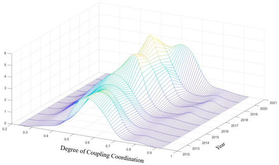 Figure 7), it can be seen that the years with smaller increases were 2013, 2018, and 2021. In contrast, the degree of coupling coordination declined in 2014, 2017, and 2021.