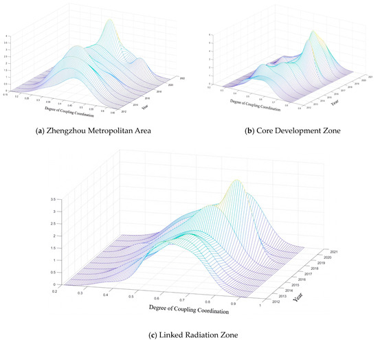 To visually and intuitively present the development level, distribution dynamics, extensibility, and polarization trends of the flood resilience coupling and coordination degree in the Central Plains Urban Agglomeration, this study depicts the three-dimensional dynamic Kernel density of flood resilience coupling and coordination degree in the region, as shown in