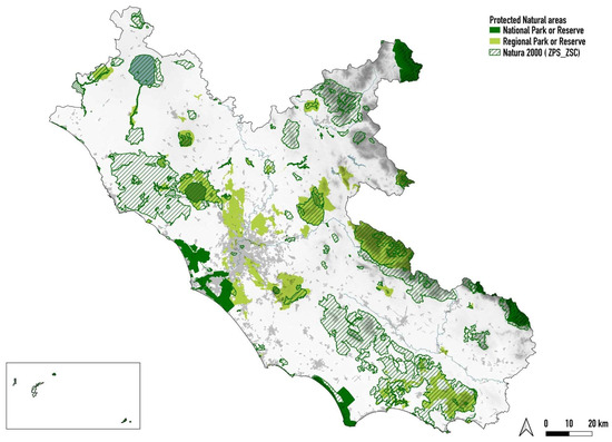 An analysis of the spatial distribution of protected areas in the Lazio Region reveals a clear predominance of sites designated under the European ecological network. Of the 174 total classified areas, 64.4% fall under Natura 2000 designations—either as Special Protection Areas (ZPS), Sites of Community Importance (ZSC), or dual ZPS/ZSC listings. In contrast, 35.6% are national or regional parks and nature reserves established under Italian law.