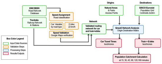 The core dataset (see Section 3) integrates multiple variables: visitor flows to major natural and cultural sites (e.g., Circeo National Park, Appia Antica), land surface data for calculating visitor density per square kilometre, and the distribution of accommodation facilities, all sourced from ISTAT, regional tourism observatories, and protected area authorities. Travel times—calculated separately for private car and e-bicycle using network analysis algorithms and IGM road network data—allow the estimation of potential accessibility from population grid centroids. Seasonal visitor load is also included to reflect temporal pressure dynamics [52].
