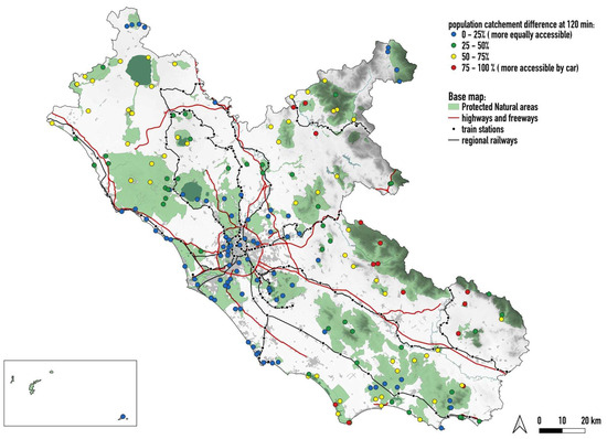 According to Geurs and van Wee [26], accessibility should not only be measured in terms of spatial proximity and travel time but also in terms of the quality of opportunities and the sustainability of access. In Lazio, road improvements, increased bus connections, rail accessibility and the archaeological zones have undoubtedly made peripheral and inner areas more reachable.