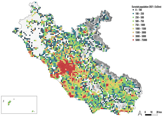 Population grid (2 × 2 km). Elaboration of authors based on GISCO–European Commission, 2021.
