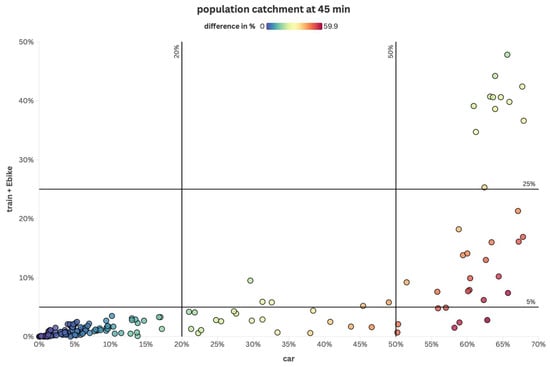 Figure 3 illustrates the differences in population catchment between private car and the train + e-bike mode. The blue areas indicate sites where accessibility is comparable across modes, while the red areas highlight locations that can be reached significantly faster by train + e-bike. This spatial pattern underscores the uneven distribution of sustainable accessibility, revealing both opportunities (red zones) and persistent car-dependency (blue zones). Particularly significant is the value of the standard deviation, which also increases with time: from ±280,000 at the 15 min threshold to over ±1.3 million at 90 min. This indicates a profound territorial unevenness: some sites—especially those located in peri-urban areas or along major infrastructure corridors—can be accessed by millions of inhabitants in relatively short times, whereas others—located in mountainous, peripheral, or poorly served areas—are accessible to a far smaller number of people.