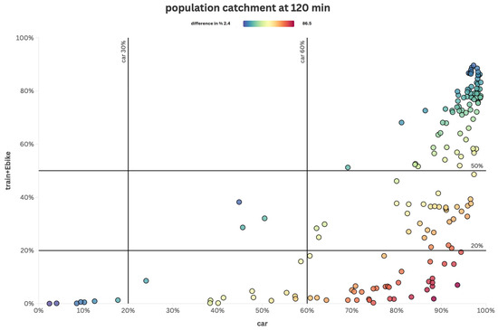 Distribution of population catchment when travelling by car and train + ebike on the isochrone 120 min. Elaboration of authors.