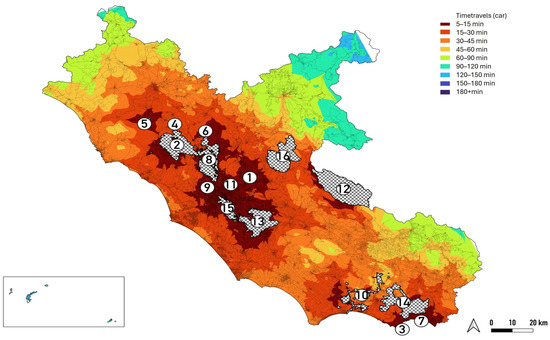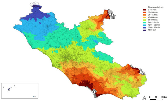 The decision to focus on these two transport modes is grounded in recent research highlighting substantial disparities in accessibility across different user profiles. Studies show that while car users can access most high-value landscapes within 30–45 min from major urban centres, access via sustainable modes remains severely restricted—especially in the southern and inland areas of Lazio, considering the approach of other studies [42,43,44]. This reflects the exclusionary effects of car-centric infrastructure on active mobility and equitable territorial access.
