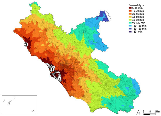 Isochrones of time travels of State Nature Reserve and distance in minutes. Elaboration of authors. Legend: (1): Litorale Romano, (2): Tenuta di Castel Porziano, (3): Salina di Tarquinia.