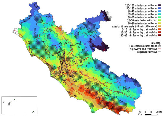 Figure 10 illustrates comparative accessibility between car and train + e-bike travel across the Lazio region. The colour gradients highlight areas where one mode is significantly faster than the other: blue shades show a clear advantage for car travel (up to over two hours faster), while orange to red shades indicate better performance of train + e-bike, particularly along rail corridors and in southern areas. The central belt shows more balanced travel times, reflecting multimodal accessibility. The overlay of highways, railways, and protected areas provides further spatial context for interpreting mobility patterns.