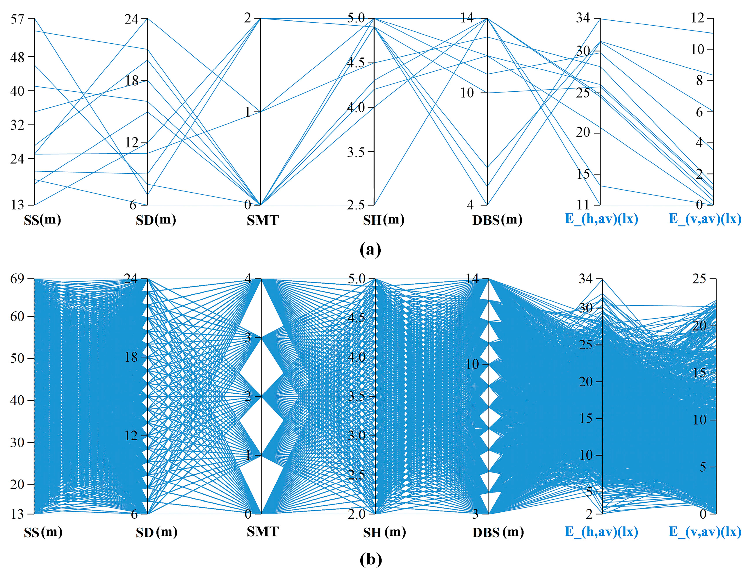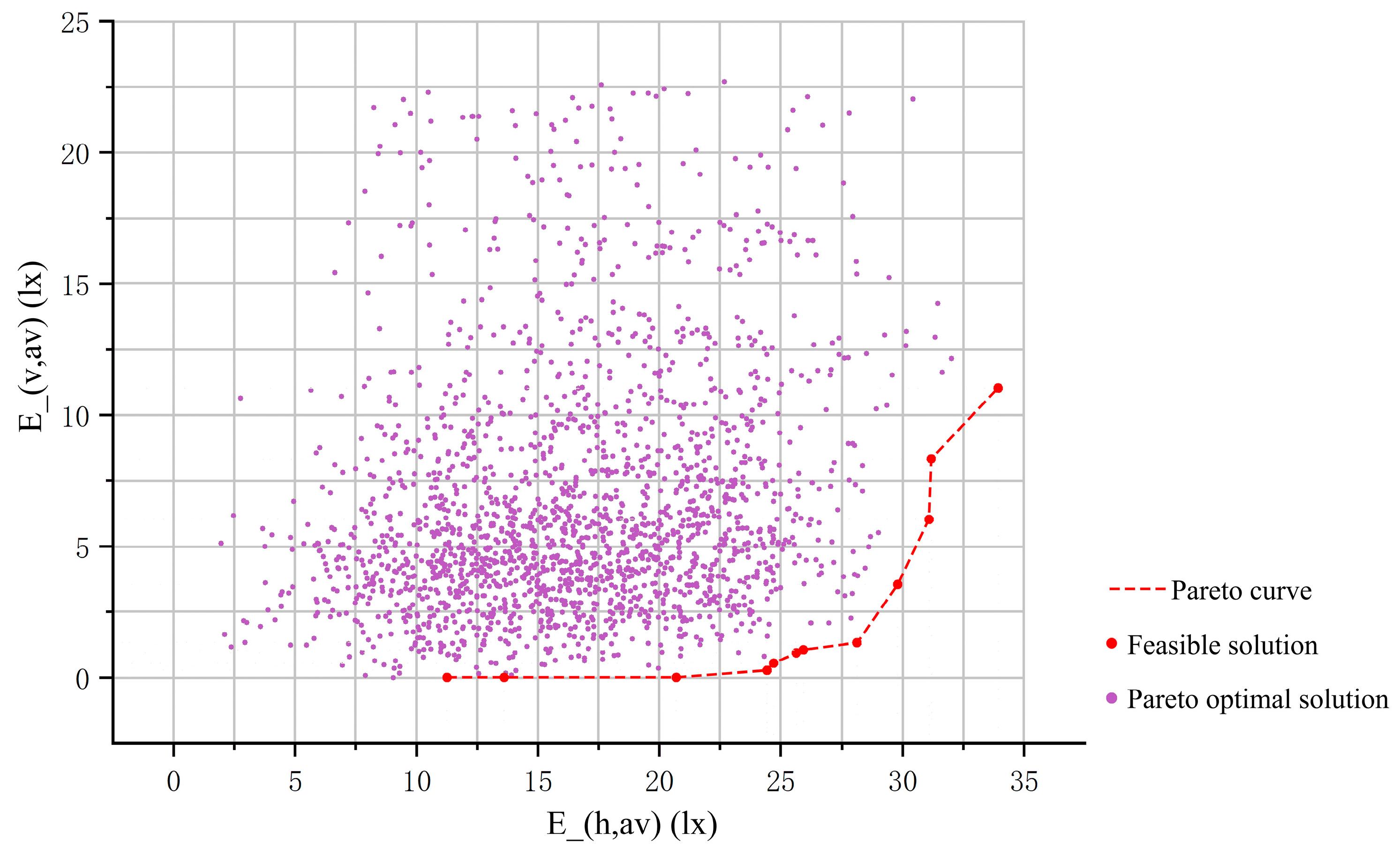 - Lou, S.; Luo, X.; Chen, Z.; Gao, Z.; Wang, R.; Feng, L.; Zhang, G.; Zhang, Y.; Zhao, Y.; Li, B. Multi-Objective Optimization of Daylighting Performance and Solar Radiation for Building Geometry Using a Hybrid Evolutionary Algorithm. Sci. Rep. 2025, 15, 26644. [Google Scholar] [CrossRef] [PubMed]