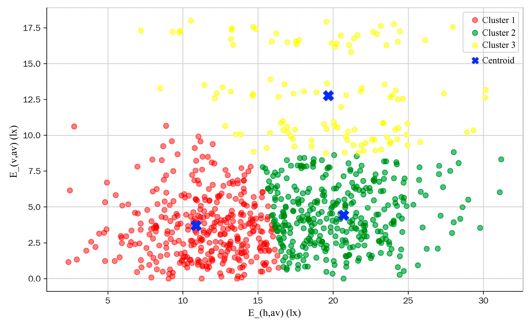 - Combining the sample concentration and performance of SMT in Cluster2, it is concluded that the lighting design of residential areas should prioritize the use of a 2 × 2 SMT.