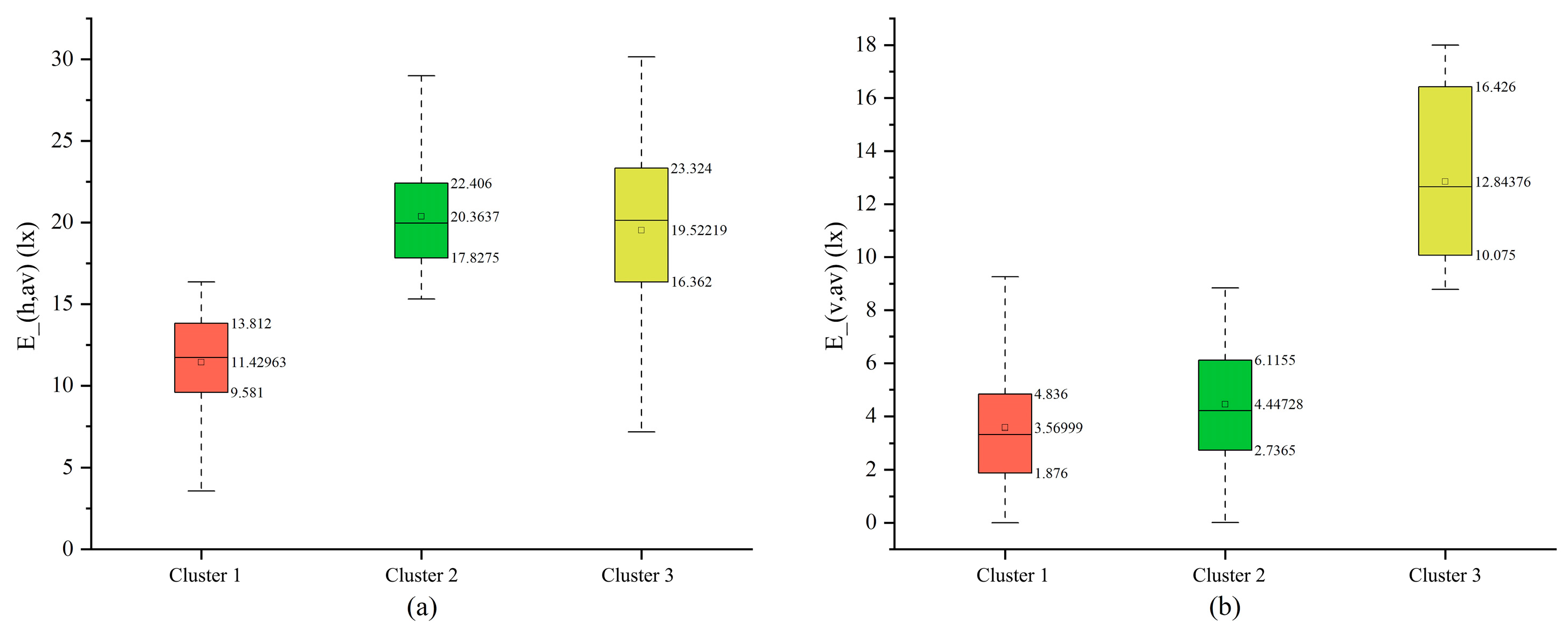 3.4.1. Horizontal Illuminance on the Ground of the Activity Place ()