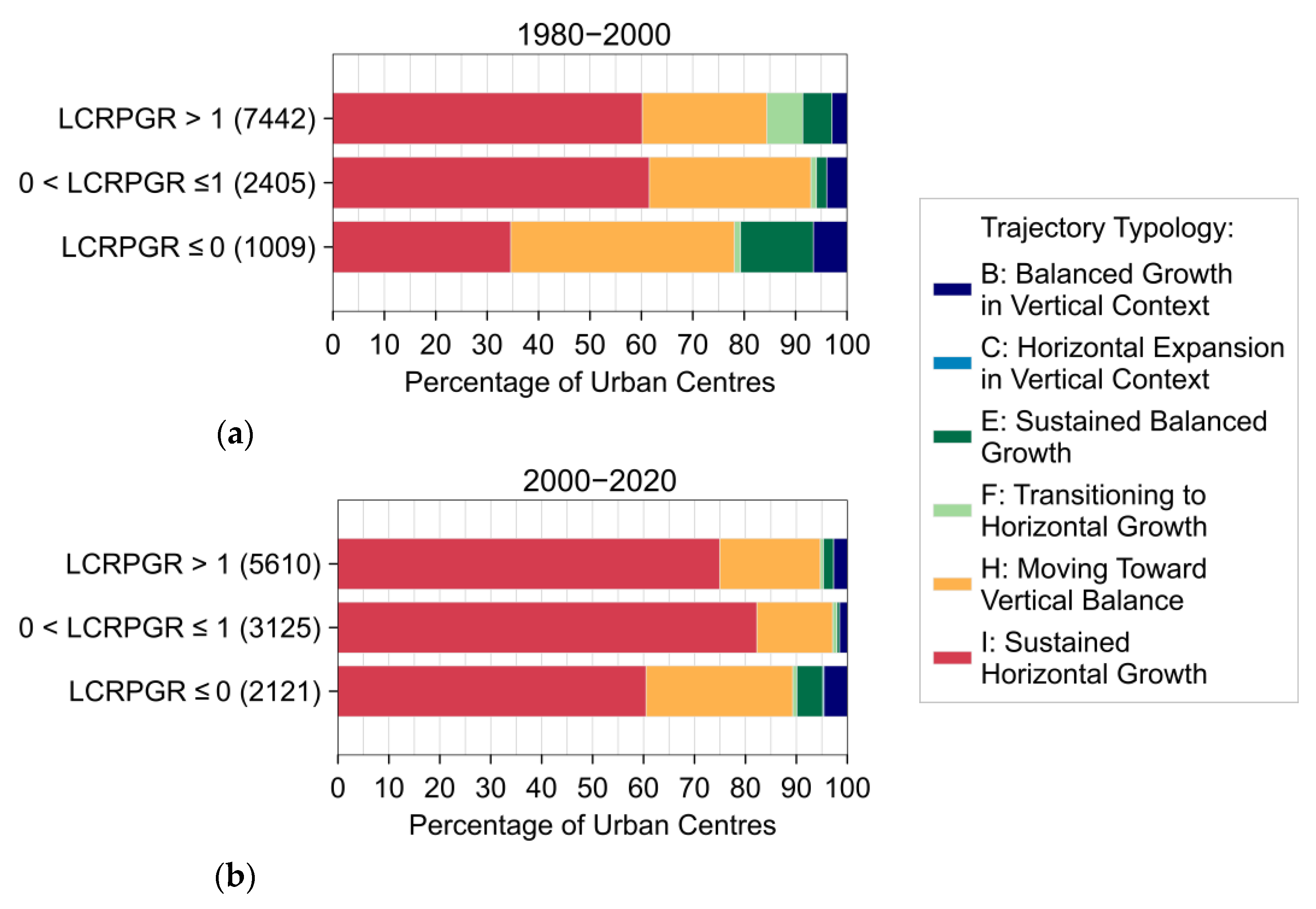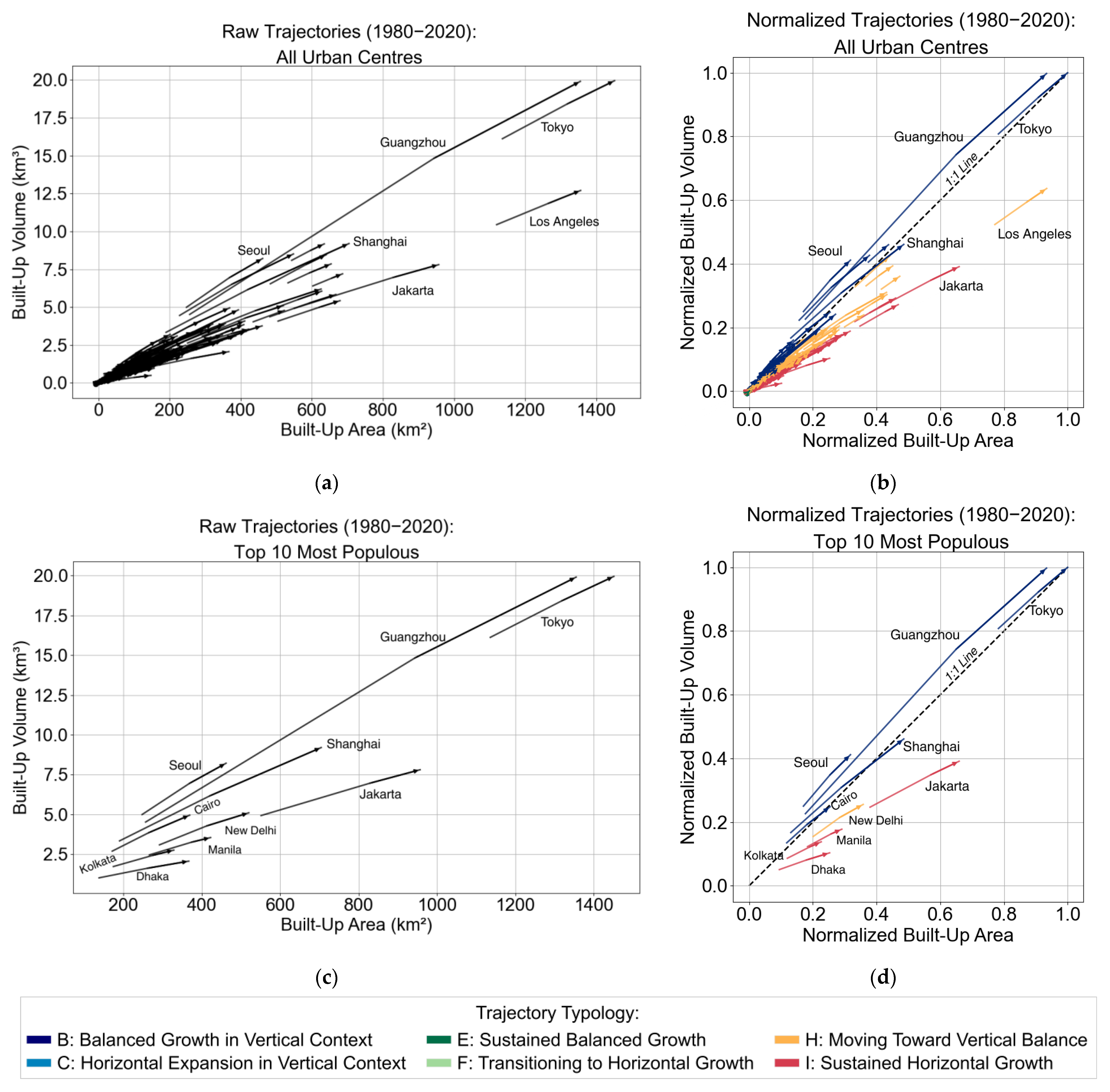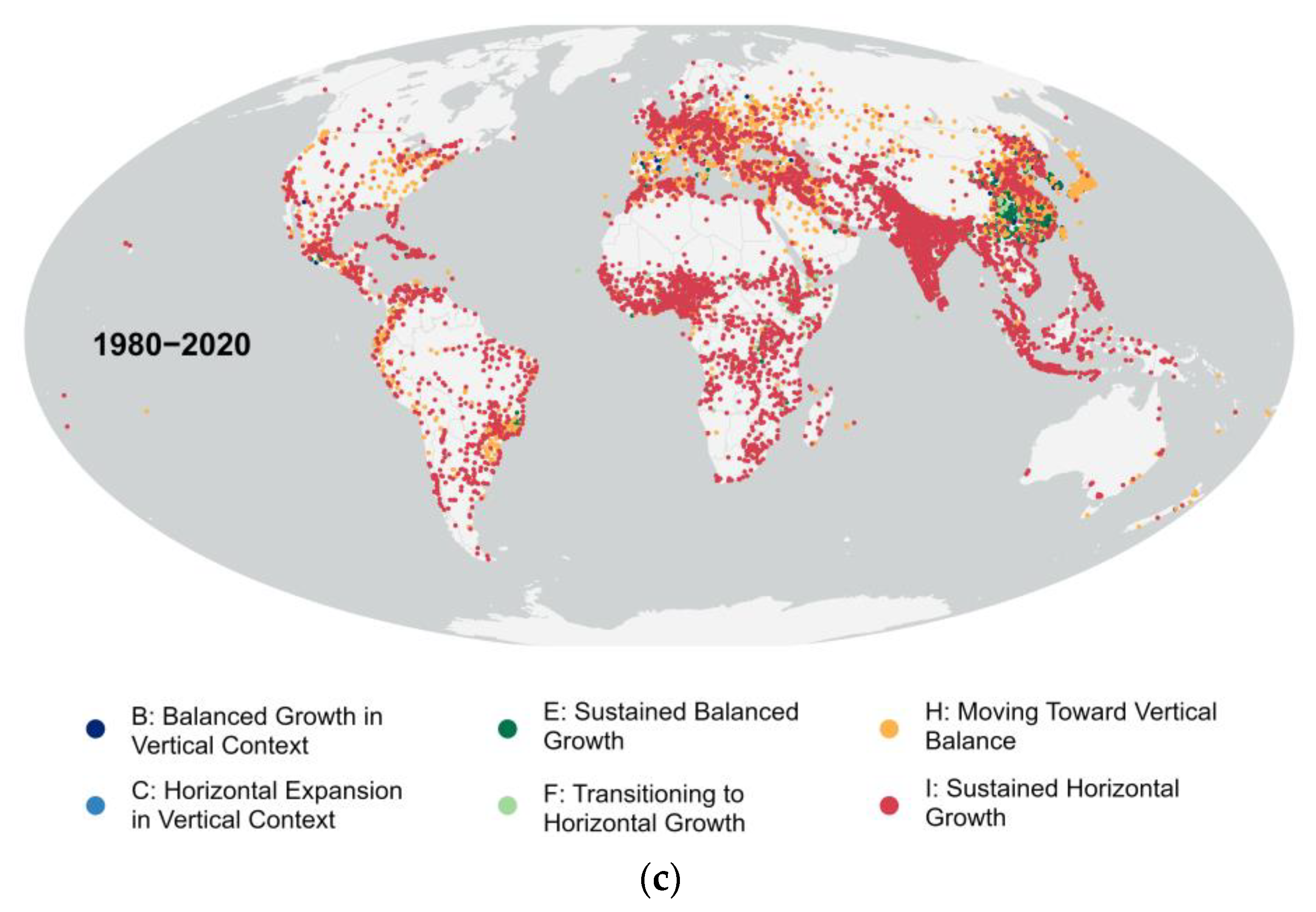 Vertically Dominant (Above the 1:1 line) | A: Vertical Intensification (Growth is driven primarily by built-up volume; vertically dominant cities become more compact.) | B: Balanced Growth in Vertical Context (BUA and BUV increase at relatively balanced rates while retaining vertical dominance.) | C: Horizontal Expansion in Vertical Context (BUA increases more rapidly than BUV, but vertical dominance remains.) |