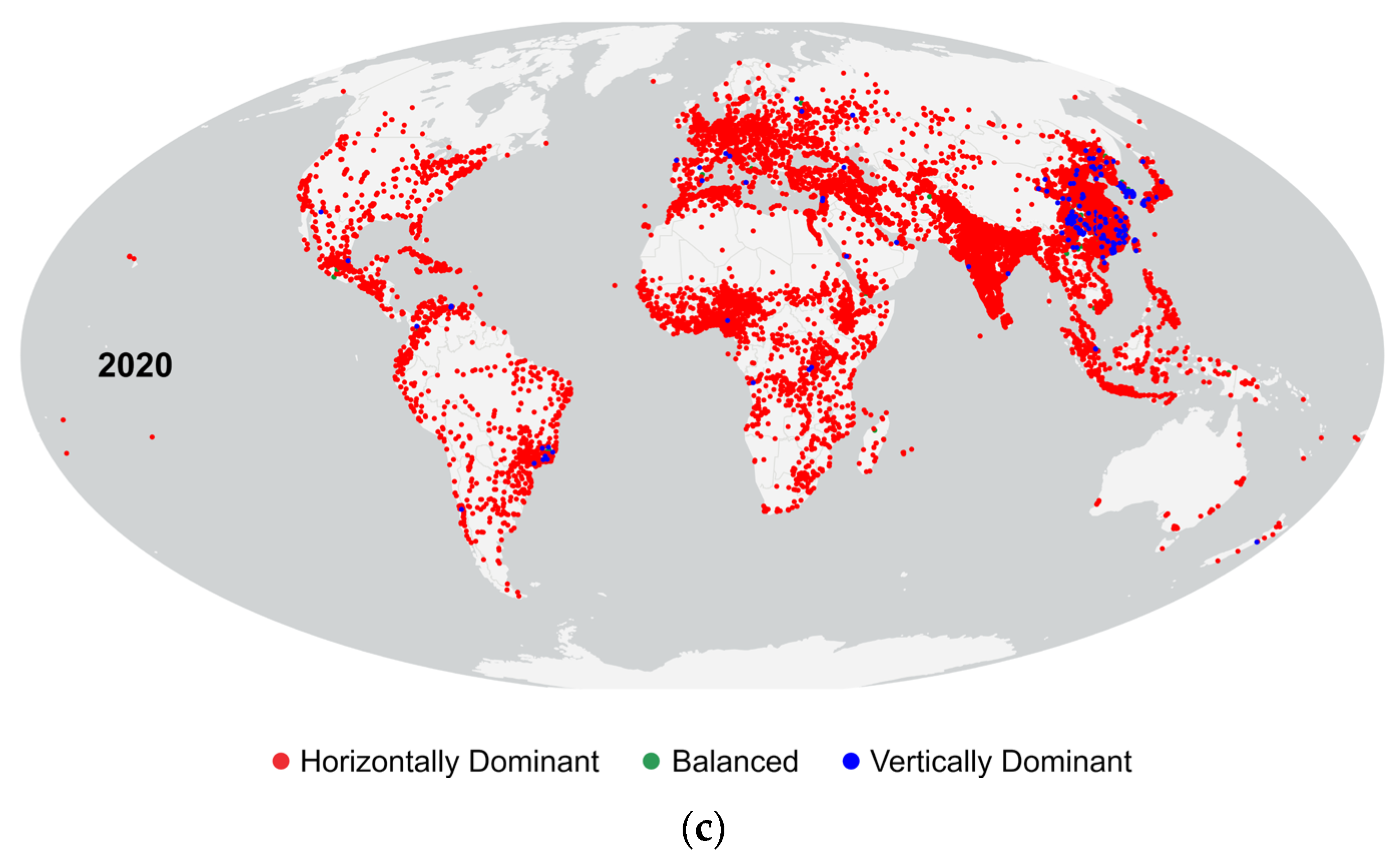 - Frolking, S.; Mahtta, R.; Milliman, T.; Esch, T.; Seto, K.C. Global Urban Structural Growth Shows a Profound Shift from Spreading out to Building Up. Nat. Cities 2024, 1, 555–566. [Google Scholar] [CrossRef]