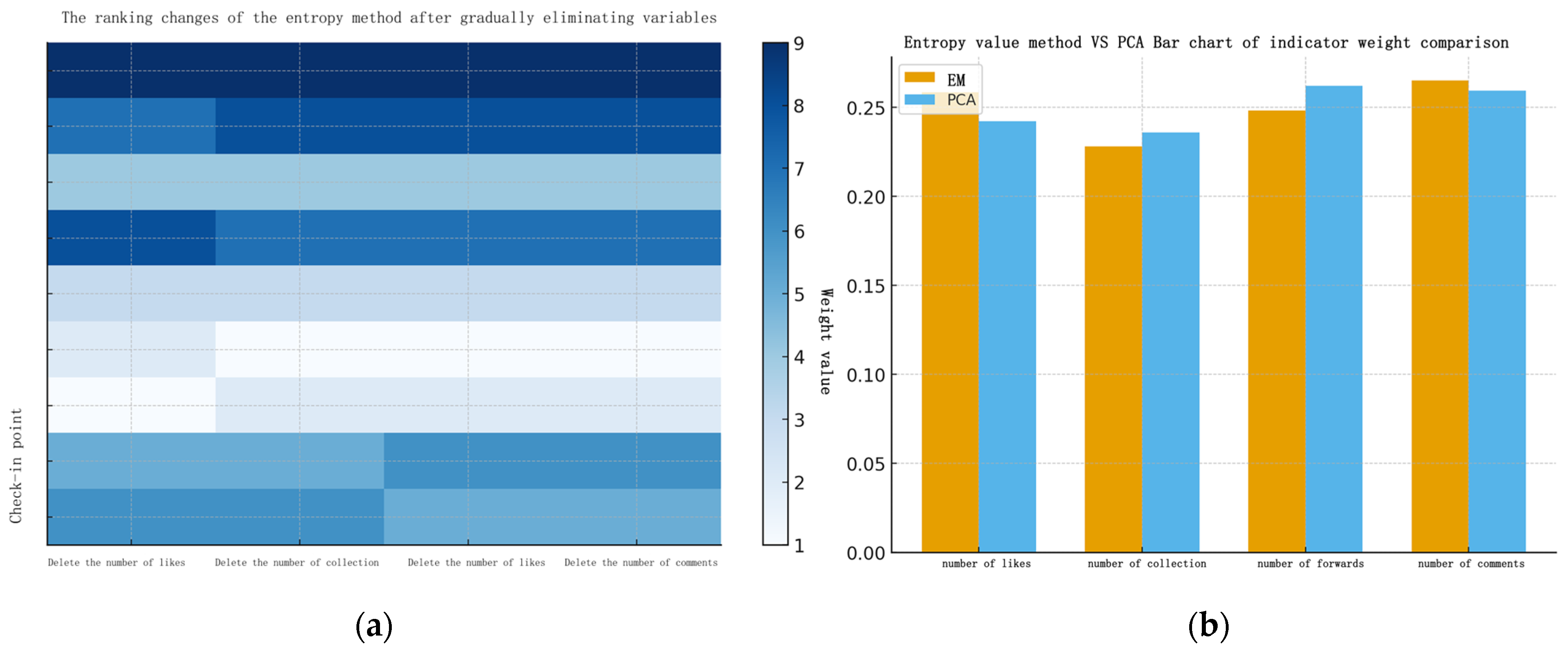 - Online check-in popularity demonstrates a pronounced spatial clustering effect. This phenomenon reveals the concentration of traffic in a few “hit” locations, with its formation mechanism closely related to visual appeal of content, user interaction behaviors, and platform algorithm recommendations. Through an entropy-based weighting model validation, this study confirms that sharing behavior contributes most significantly to online popularity, highlighting the critical role of cross-circle dissemination.