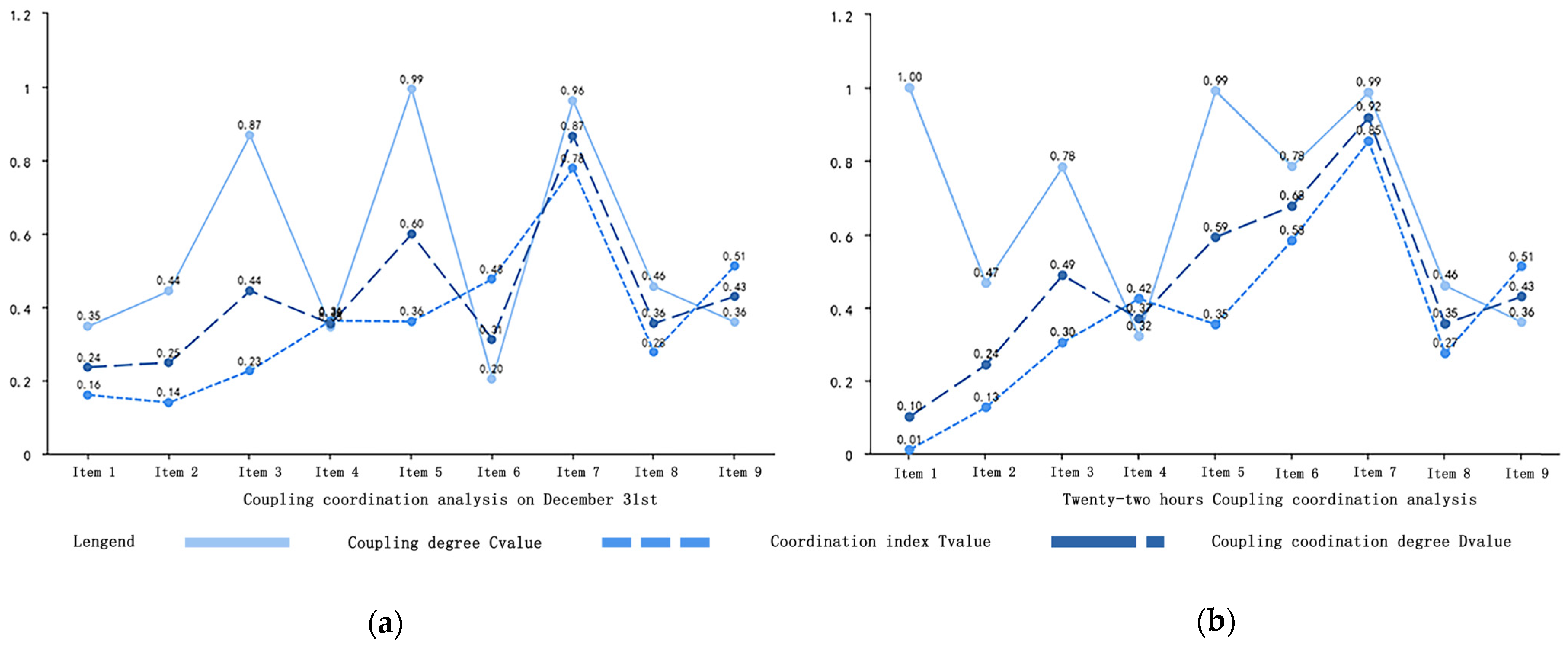 - Results from the coupling coordination model reveal that online–offline interactions follow a dynamic evolutionary pattern. High-quality coordination tends to occur during peak periods such as holidays, reflecting efficient alignment between online traffic and offline capacity. In contrast, maladjusted states are mainly observed in regular periods, arising from insufficient online-to-offline conversion or offline overload, thus generating evident spatio-temporal differentiation.
