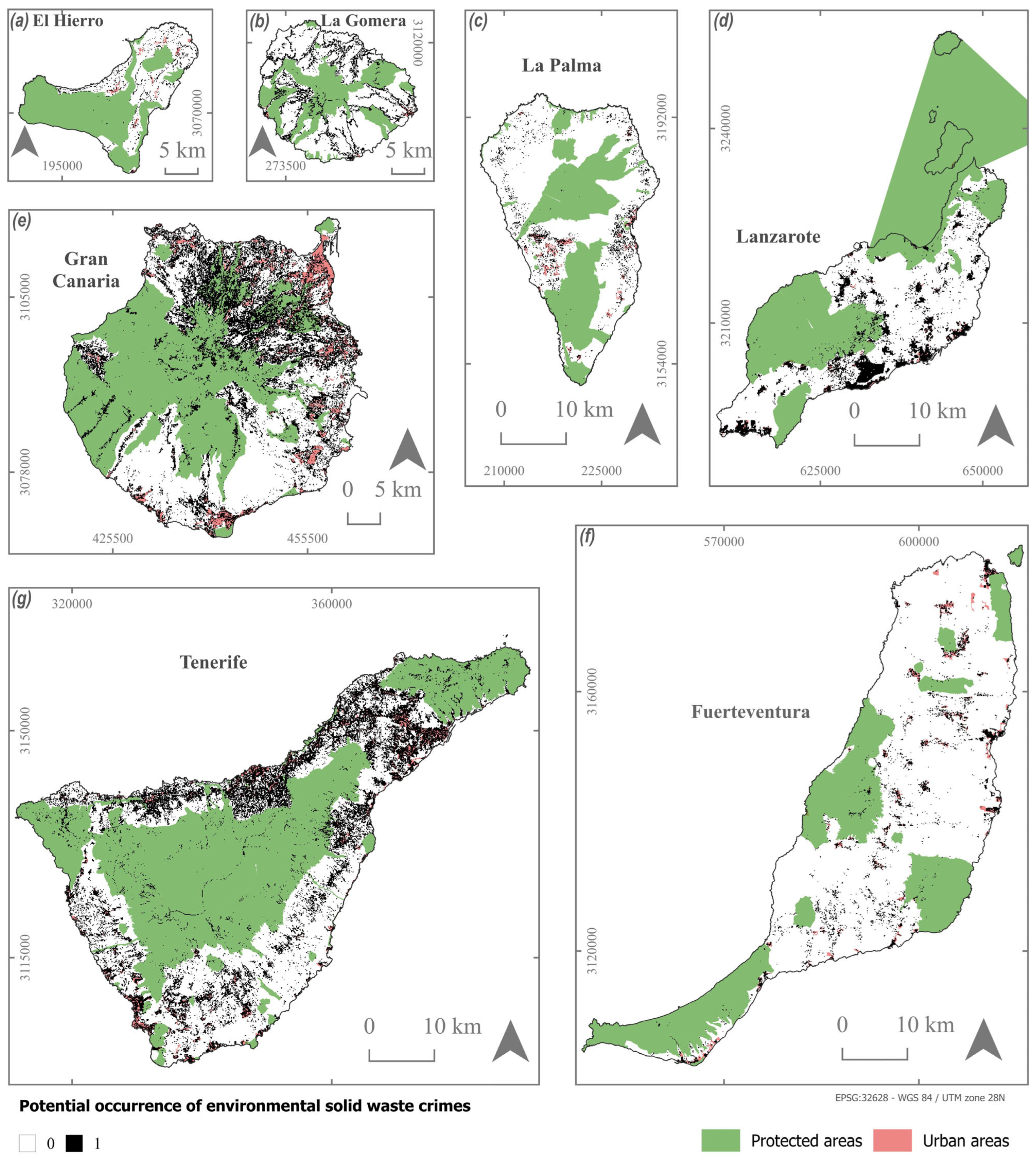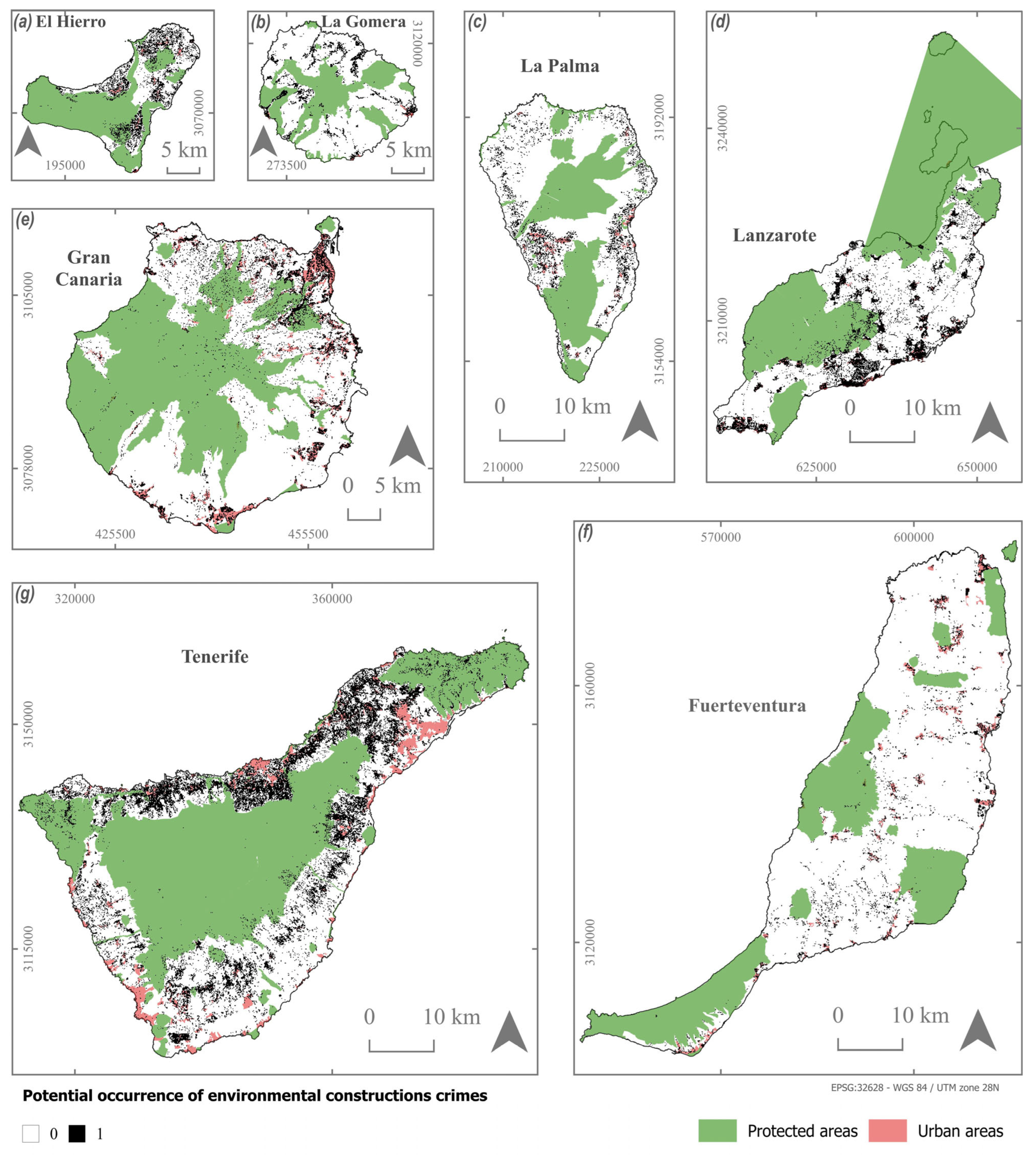 - Quesada-Ruiz, L.C.; García-Romero, L.; Ferrer-Valero, N. Mapping environmental crime to characterize human impacts on islands: An applied and methodological research in Canary Islands. J. Environ. Manag. 2023, 346, 118959. [Google Scholar] [CrossRef]