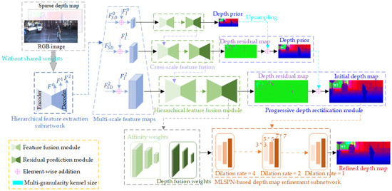 As shown in Figure 3, the hierarchical depth completion subnetwork is adopted to produce a robust initial depth map. The hierarchical feature fusion module that gradually fuses the multi-scale feature maps is used to generate an accurate depth residual map, and the progressive depth rectification module that gradually rectifies the low-resolution depth map by utilizing the generated high-resolution depth residual map is implemented to achieve high-quality depth map prediction.