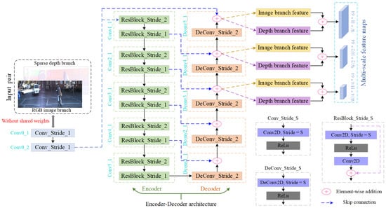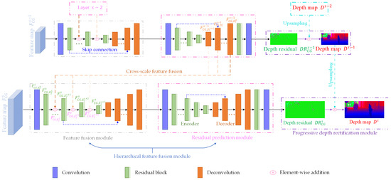 Subsequently, deconvolutions with a skip connection operation are employed to decode the encoded hierarchical feature representations to generate a more robust feature map. For the residual prediction module, a 2D convolution and residual blocks with a stride of 2 are also adopted to extract deeper contextual feature representations, and then deconvolutions with a skip connection operation, a residual block, and a 2D convolution are applied to produce the accurate and reliable depth residual map .