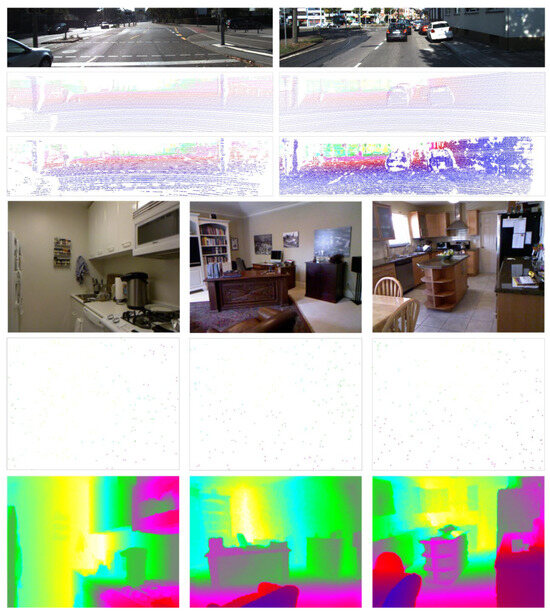 Overview of some representative scenes in both datasets. From top to bottom represent the RGB images, the sparse depth maps, and the ground-truth depth map of the KITTI DC and NYUv2 datasets.