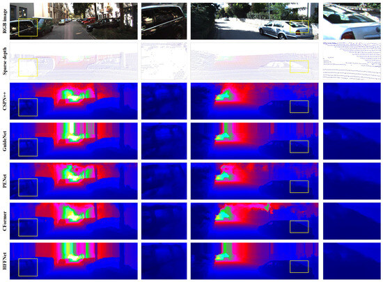 As shown in Table 6, HFF-Net can obtain superior depth completion results at almost all the sparsity levels in terms of the RMSE score. This indicates that fusing the multi-scale feature representations can ensure that HFF-Net learns more global contextual information to achieve accurate and reliable depth completion results. Furthermore, it can also be found that the depth completion quality of GuideNet is significantly lower than that of the comparison methods for the sparser levels of the 8-line, 4-line, and 1-line scenarios. This demonstrates that the SPN-based depth refinement strategy is essential for producing state-of-the-art depth completion results. Meanwhile, as exhibited in the yellow rectangle regions in Figure 9, HFF-Net has greater advantages in preventing depth ambiguities in areas with extremely sparse depth measurements. The reason for this is that the low-resolution feature representations can provide reliable long-range dependencies for extremely sparse depth measurements, and thus a more robust initial depth map and affinity weights can be obtained by progressively fusing the low-resolution feature representations. In addition, the MLSPN-based depth map refinement subnetwork is adopted, which utilizes the robust multi-scale affinity weights to further refine the predicted initial depth map in a coarse-to-fine manner to achieve high-quality depth map reconstruction. However, as shown in the black regions in Figure 9, when fusing the low-resolution feature representations, the details and boundary features are lost. In our future work, we will explore more effective strategies to overcome this limitation to further improve the quality of the predicted depth map.