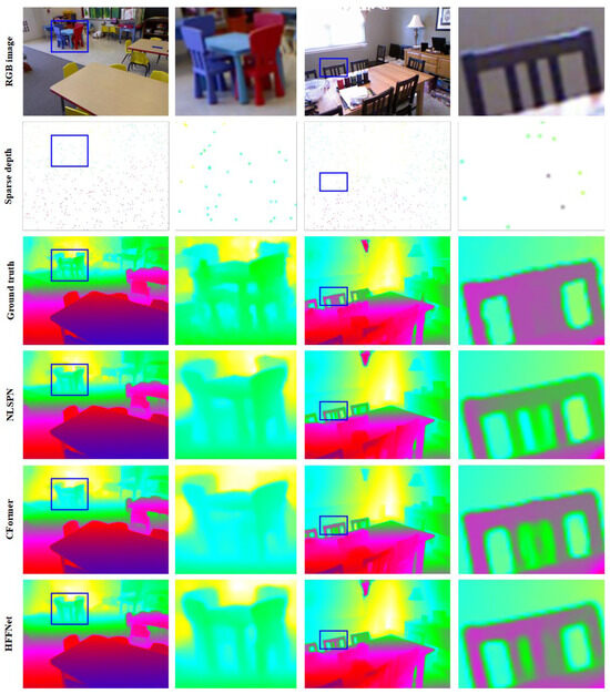Qualitative comparison of the predicted dense depth maps with those of some of the state-of-the-art methods on the NYUv2 test set. The second and last columns are the enlarged results of the blue rectangular regions of the first and third columns, respectively. From top to bottom, respectively, are the RGB images, sparse depth maps, ground-truth depth maps, and the predicted depth maps of NLSPN, CFormer, and HFF-Net.