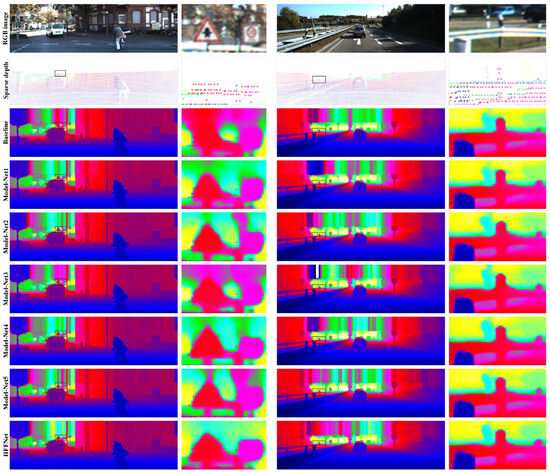 Qualitative comparison of the predicted depth maps of the different model variants on the KITTI DC validation set. The second and last columns are enlarged parts of the black rectangular regions of the first and third columns, respectively. From top to bottom are the RGB images, sparse depth maps, and the predicted depth maps of Baseline, Model-Net1, Model-Net2, Model-Net3, Model-Net4, Model-Net5, and HFF-Net, respectively.