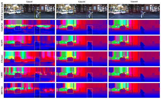 In general, good depth completion architecture should have the ability to be suitable for different-level sparsity measurements. To validate the robustness of HFF-Net at different-level sparse depth representations, we first trained HFF-Net on the 64-line LiDAR depth maps of the KITTI DC training set, and then tested its performance on the validation set across various sparsity levels that were obtained by referring to Zhao et al. [72]. For a fair comparison, all the comparison methods were retrained with the same parameter settings, including the optimizer, training epochs, and learning rate. Table 6 and Figure 9 provide the quantitative and qualitative comparison results.