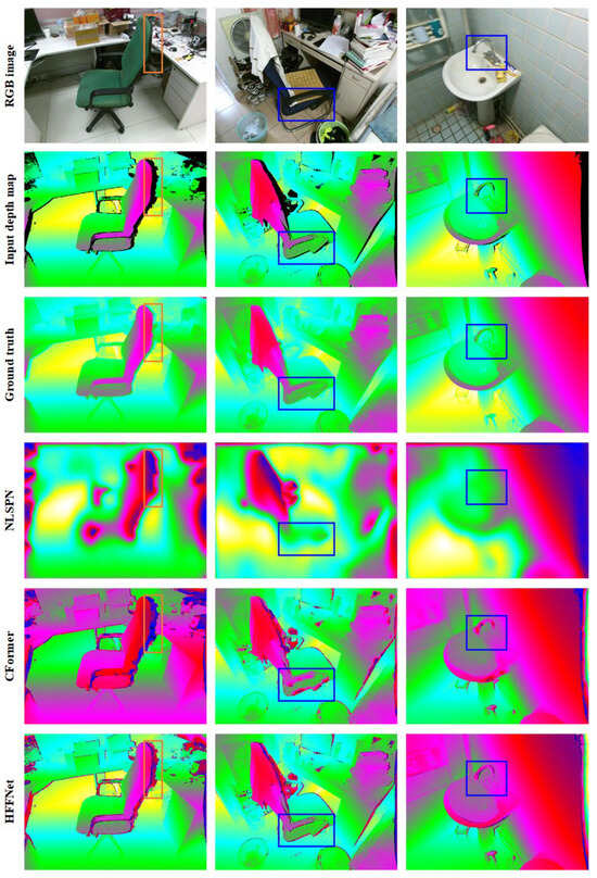 The indoor SUN RGB-D test set [73] was used to validate the zero-shot generalization performance of the proposed HFF-Net architecture. For the SUN RGB-D test set, which consists of 5050 image pairs (where each image pair contains an RGB image and the corresponding synchronized depth map) captured by Microsoft Kinect sensors, and the image resolution is 640 480 pixels. Similarly to the method of SparseDC [18], in the experiments, we used the synchronized depth maps as sparse depth maps, and the inpainted depth maps as ground truths. Meanwhile, the pre-trained models on the NYUv2 dataset were directly used to quantitatively and qualitatively compare the generalization performance of HFF-Net and some representative methods (i.e., NLSPN and CFormer). As shown in Table 7, the RMSE and REL scores of HFF-Net are 0.490m and 0.109 for the SUN RGB-D test set, respectively. This reveals that HFF-Net has better generalization performance for unseen environments. In addition, we can also find that HFF-Net has fewer model parameters than NLSPN and CFormer architectures. Figure 10 further shows the qualitative comparison of the completed depth maps of some representative scenes on the SUN RGB-D test set. As reported in the blue rectangular regions in Figure 10, which also indicates that HFF-Net can produce better depth completion results.