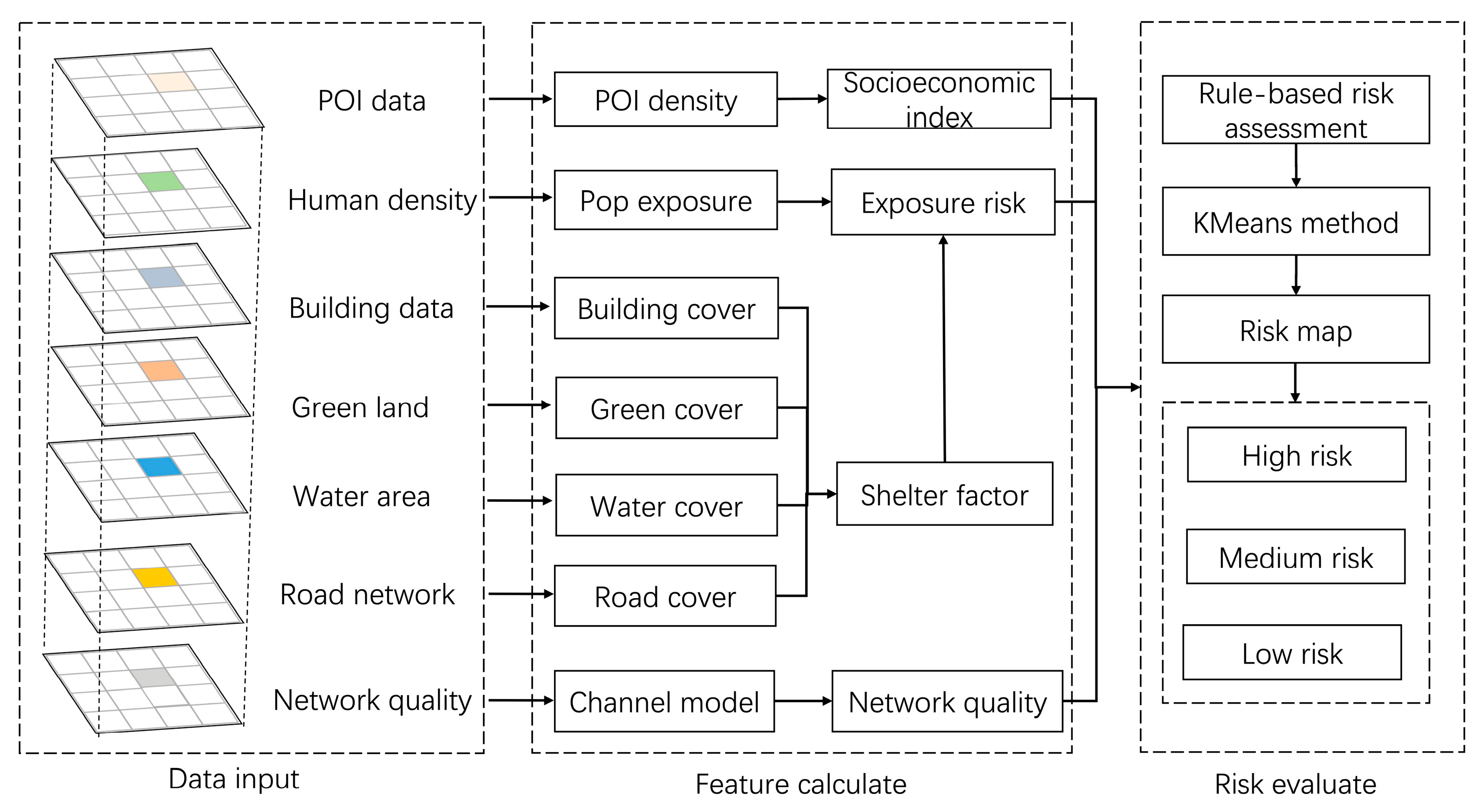 This study presents a three-dimensional low-altitude airspace risk assessment framework that integrates multi-source geospatial and communication data. As illustrated in