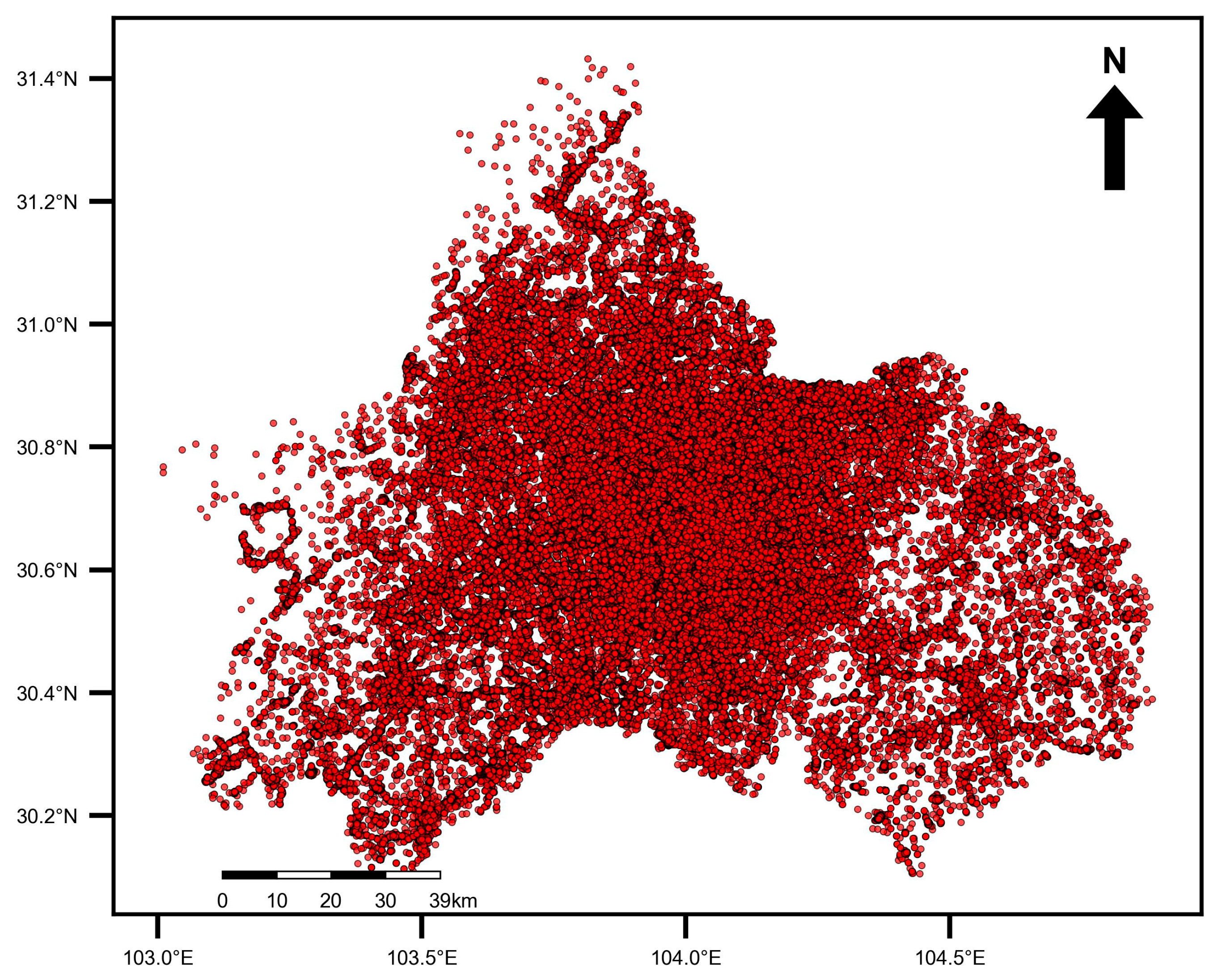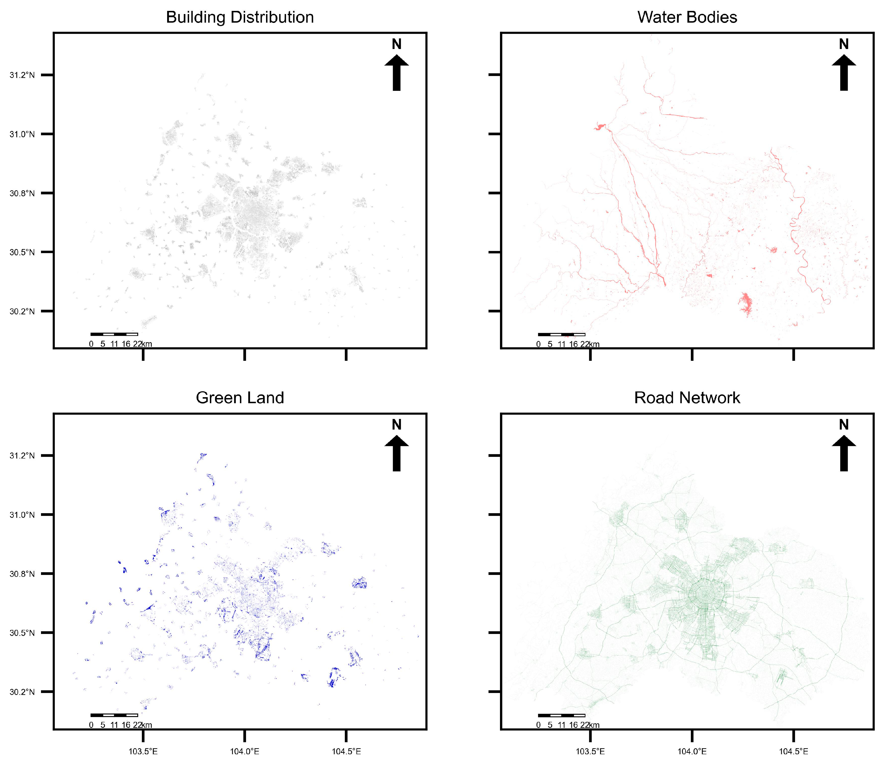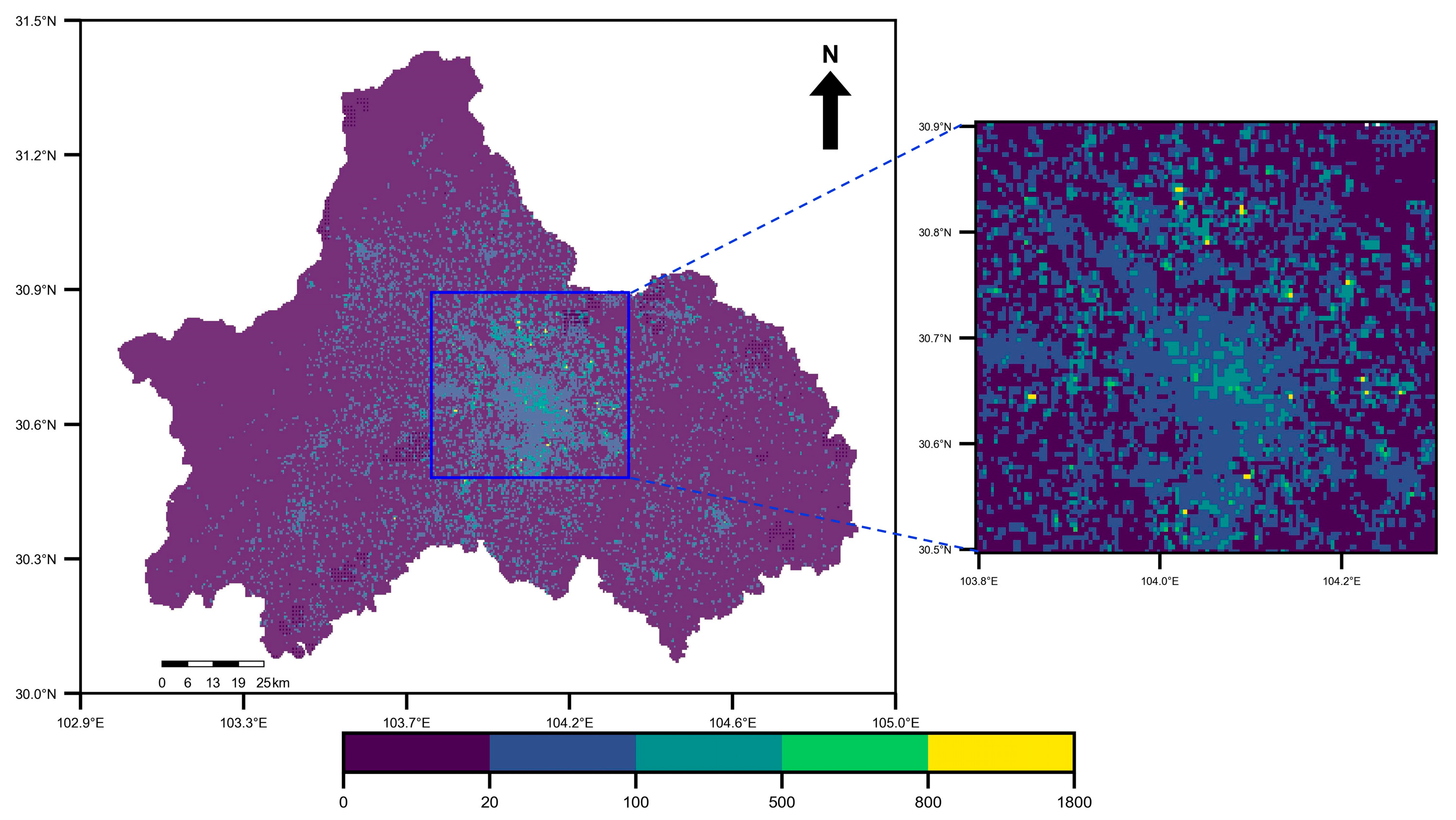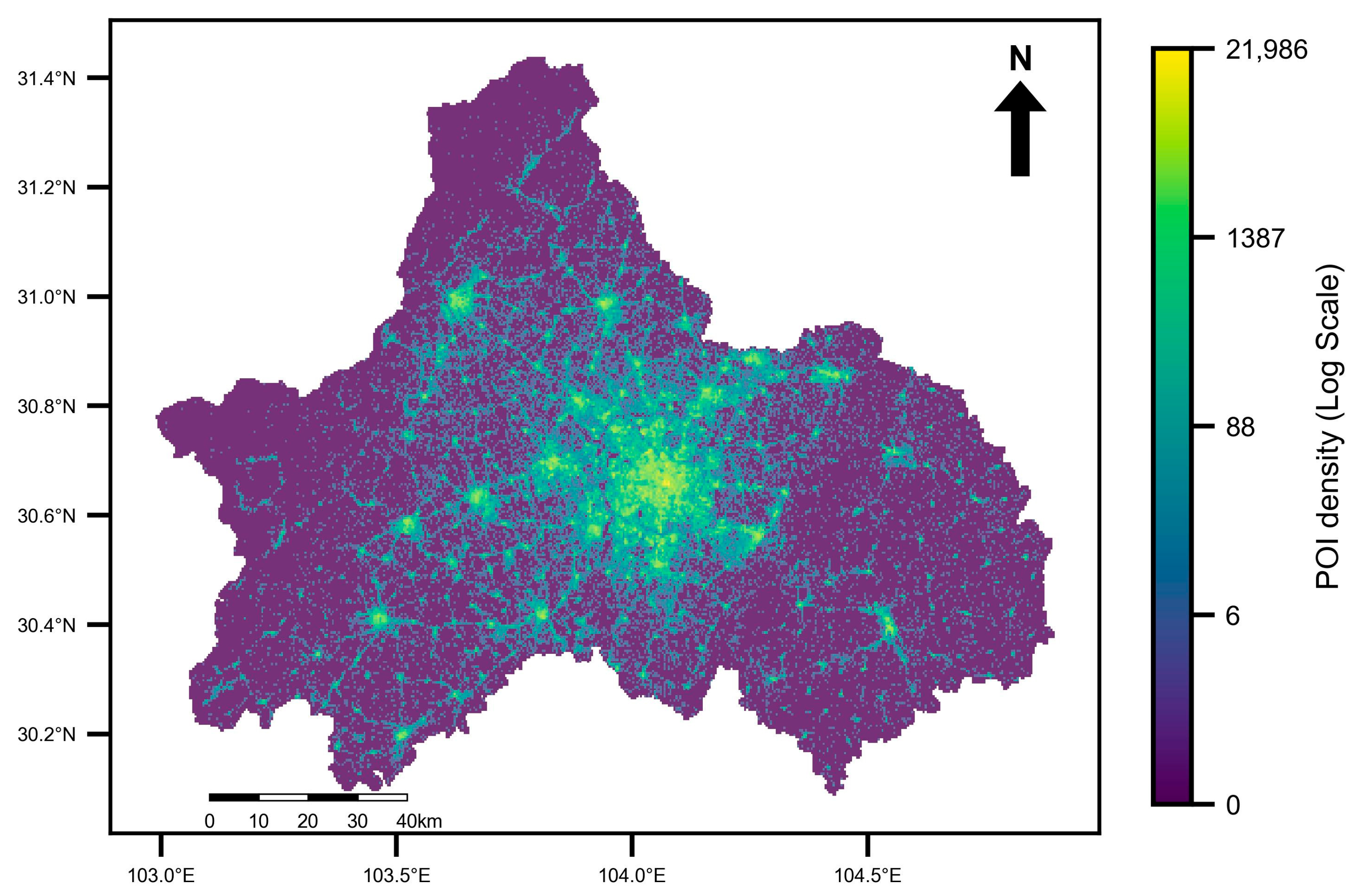 26]. POI data, with its large sample size and rich information, can provide insights into various urban activities. Typically, POI data includes multiple types such as commercial land, finance, green spaces, research institutions, and more. Initially, POI types can be reclassified according to specific scenario requirements into seven major categories: commercial and financial, public facilities, government institutions, transportation facilities, natural land, education and research, and residential land. Subsequently, the density of all POI types within each grid unit can be calculated to represent the economic development level within that unit. A higher POI density may indicate greater economic significance for the area.