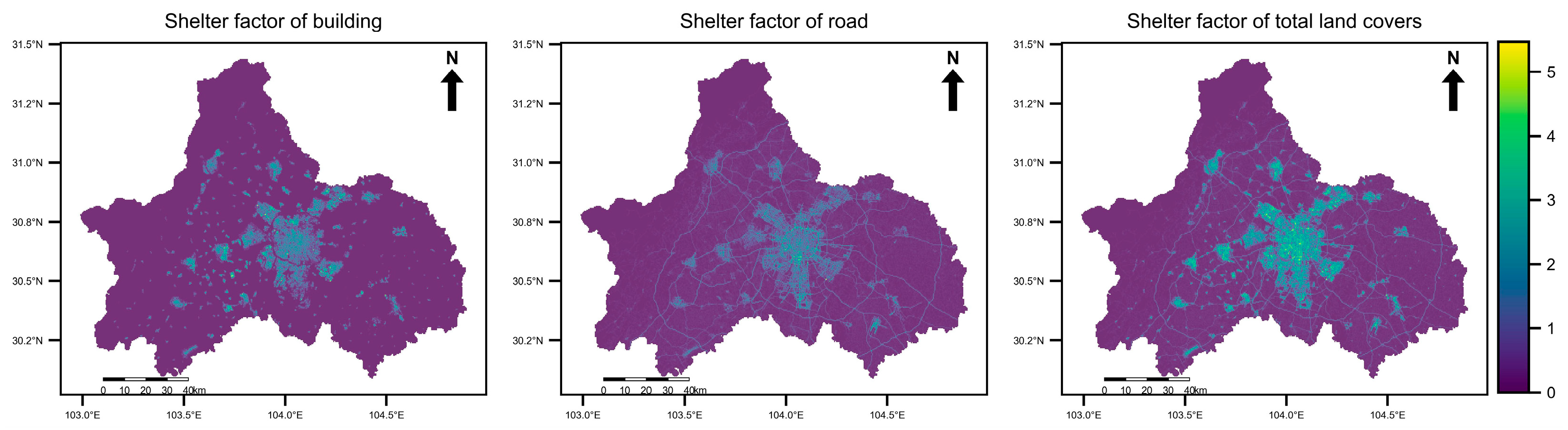 19]. However, a grid unit may contain many different types of shelter factors. The total shelter factor for ach grid unit is calculated by weighting the area of each ground cover type by its corresponding shelter factor. The total shelter factor of the grid unit is then obtained by summing the shelter factor values of all ground covers within the grid unit.