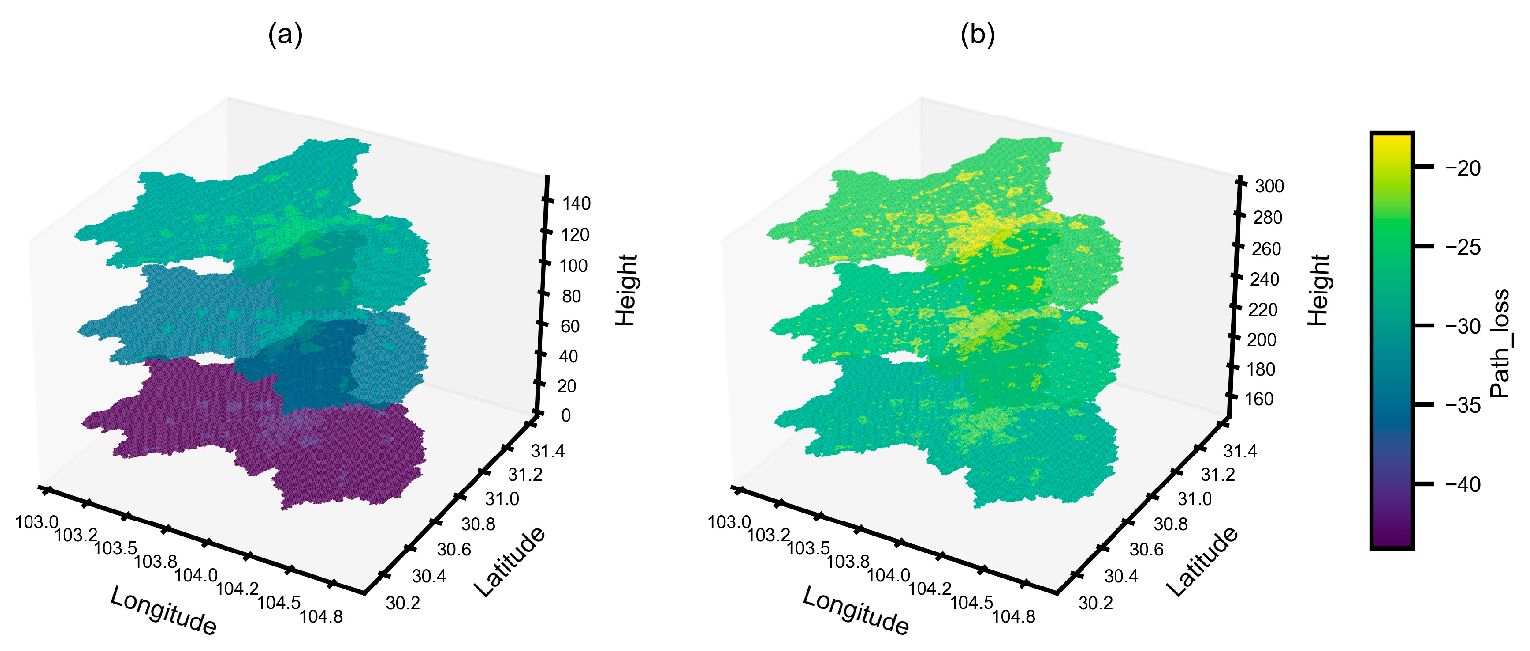 15]. Thus, evaluating the signal quality of UAVs within the flight airspace has emerged as a crucial indicator for low-altitude airspace risk assessment. Currently, there are two main methods for assessing the network signal environment. The first method involves drones equipped with onboard communication terminals or detecting devices based on fourth generation (4G) or fifth generation (5G) communication signals. This method can typically obtain indicators such as Reference Signal Receiving Power (RSRP), Signal to Noise Ratio (SNR), bit error rate, and throughput rate to comprehensively evaluate the network environment. However, this method faces challenges in covering the entire urban airspace across different heights. The second method involves developing a network signal evaluation model to assess the signal quality of drones flying in urban areas. Existing research has developed statistical models for air-to-ground path loss to estimate network signal quality in urban environments [