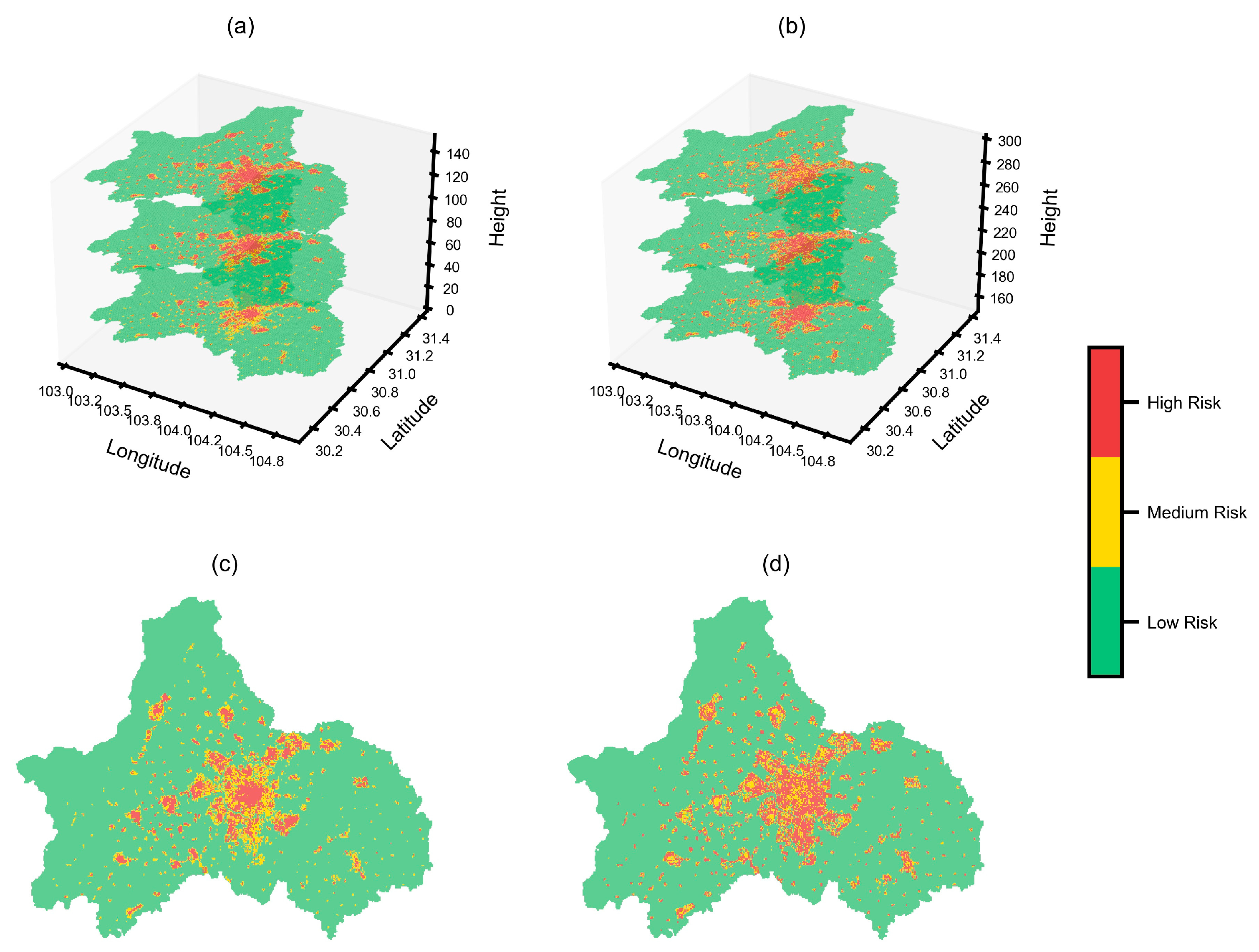 34]. Given the numerous and complex factors influencing airspace risk, this study focuses on proposing a three-dimensional risk assessment method that integrates multi-source data. Future research will aim to incorporate more variables affecting airspace risk dynamics to improve the accuracy of risk assessments and ensure the safe operation of UAVs in low-altitude environments.